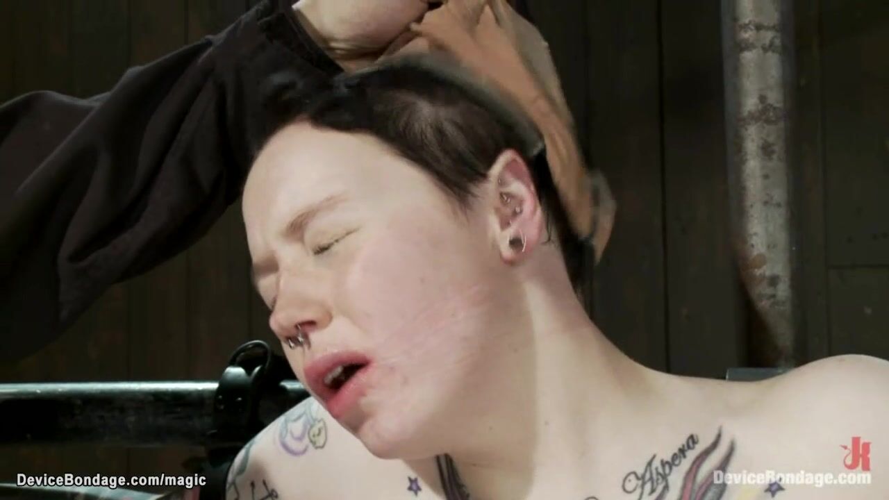 Two brunette slaves Juliette March and Ruby Reaper are strapped to metal devices with legs open get pussies machine fucked while they are blindfolded in dungeon