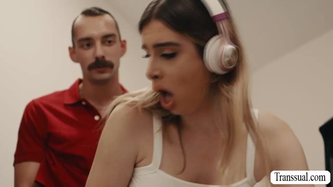 Pervert stepdad rips off shemale stepdaughters jeans and he then barebacks her tight ass so hard.After that,they move into the bathroom and he then throats her shecock and bareback her wet ass again and again.
