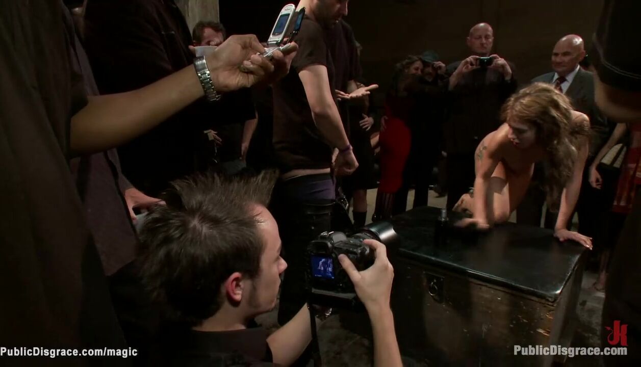 Bound on knees by James Deen and Princess Donna Dolore big tits slave Amy Brooke gets mouth fucked and pussy fingered in crowded public place