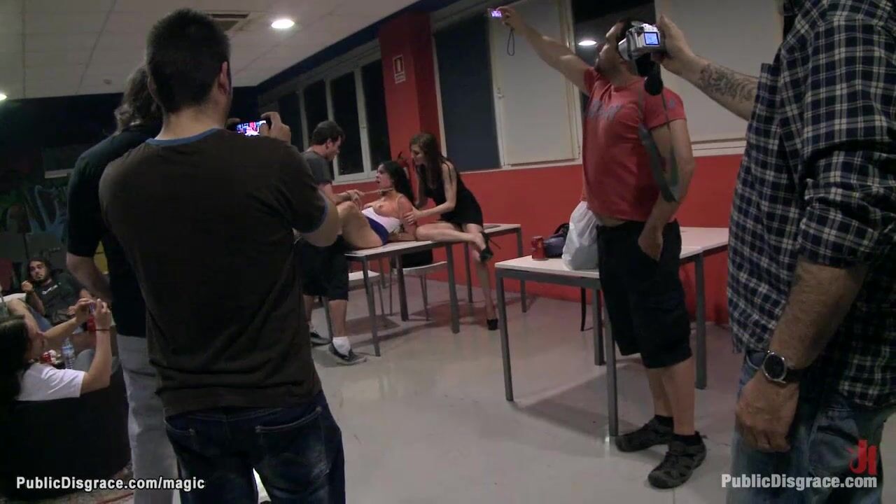 Princess Donna Dolore binds curvy Spanish babe Salma de Nora and makes her get big cock in wet pussy from James Deen outdoors in public for onlookers