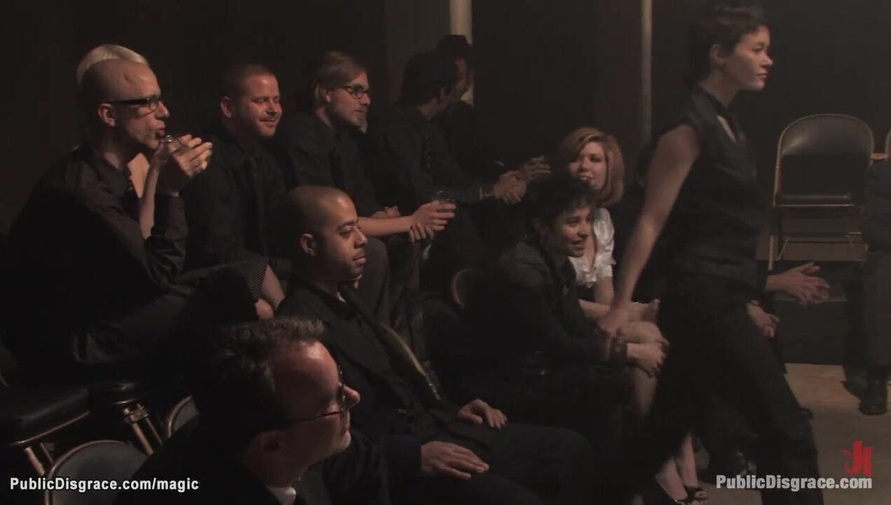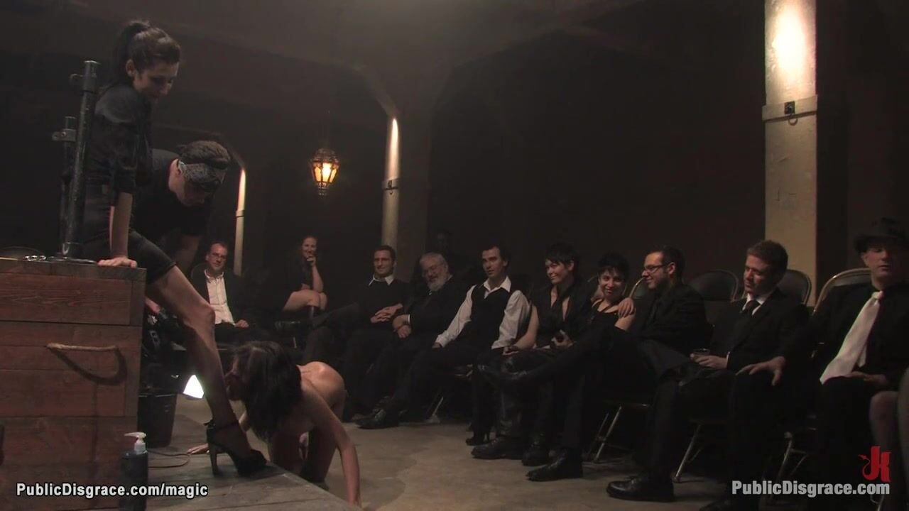 Bound on knees and bent over with hands in strappado brunette slave Cecilia Vega gets ass fingered and plugged then anal fucked in public by big cock John Strong