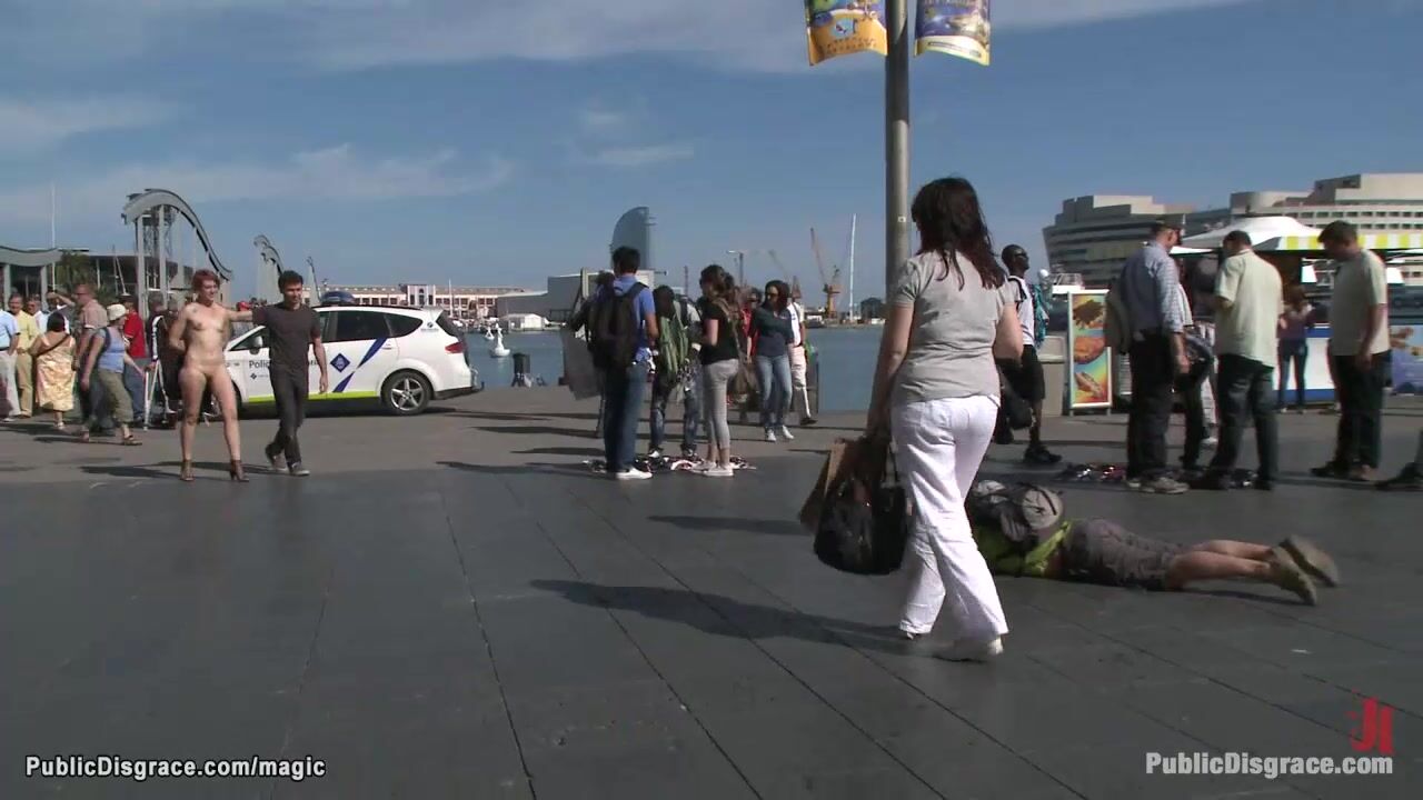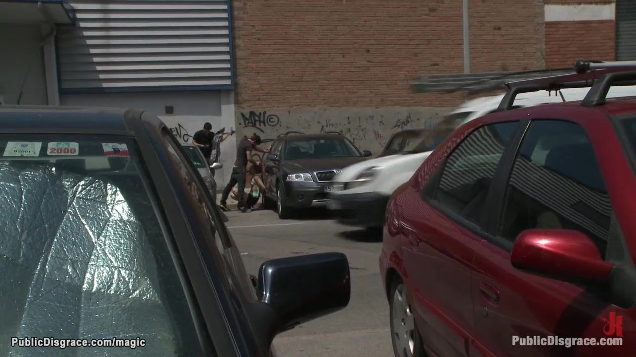 Roped hands behind back Spanish redhead babe Yakima Squaw gets pussy fucked lean on car outdoors then anal fucked and walked naked around city by big cock master James Deen