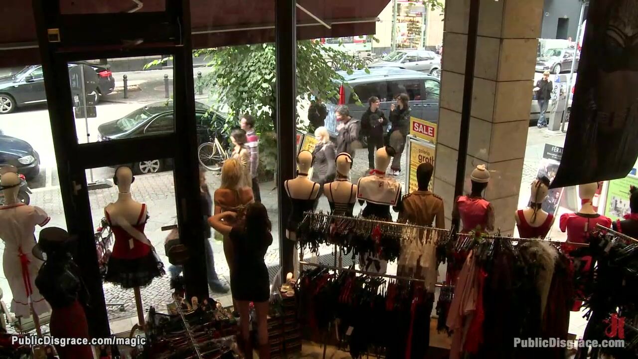 Naked blonde Blanche is bound in public shop window then ass whipped on the bench in the park by Princess Donna Dolore and fucked by big cock Zenza Raggi