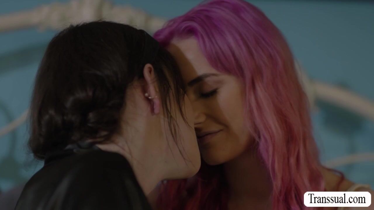Brunette shemale and her pink haired roommate are on the bed kissing each other passionately.After that,she lets her roommate throat her hard shecock and in return,she sucks her nipples and then fucks her tight wet pussy so deep and hard.