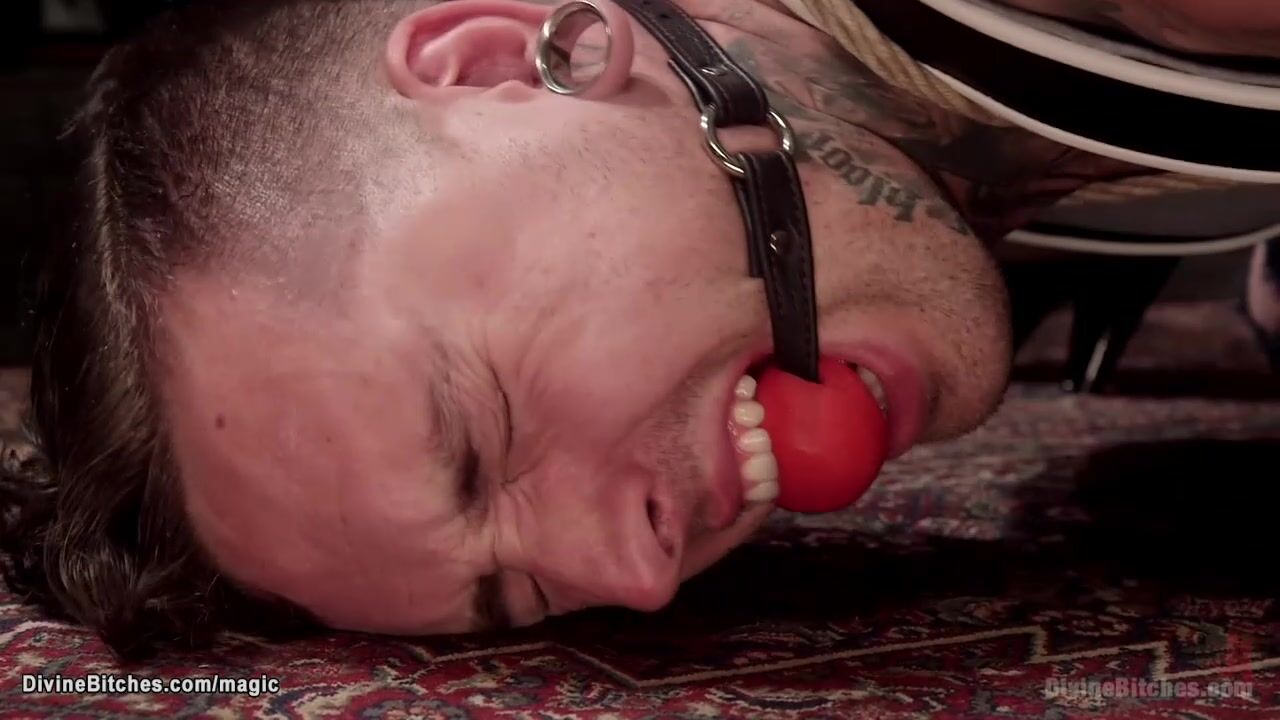 Punk rock Goddess Lola Luscious paddles gagged and bound tattooed man Ruckus XXX then pegs him with strap on cock and makes him fuck her hairy pussy