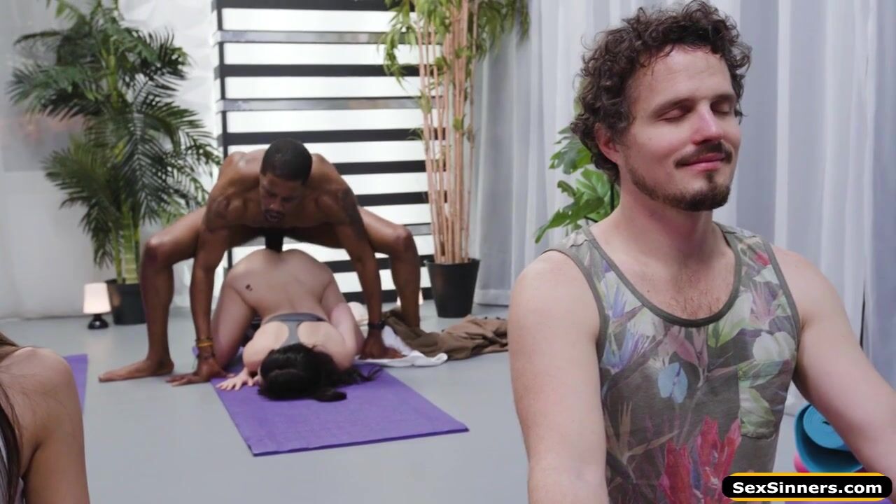 Black yoga teacher kisses his petite student during class.While the rest has their eyes closed he takes his big black cock out and the brunette deepthroats his bbc.In a doggystyle position he bangs the babe.On her back she gets her hairy pussy fucked