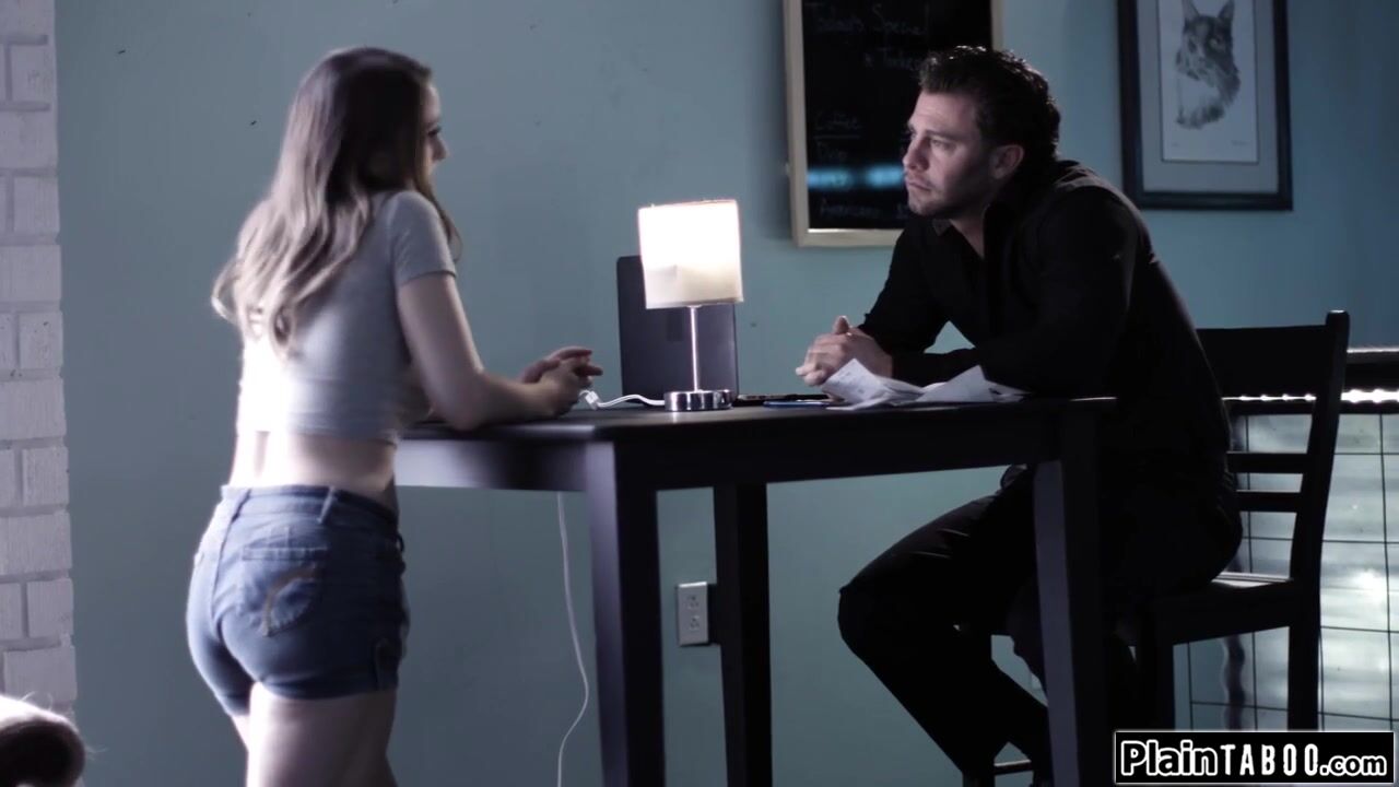 Petite brunette really needs the job and offers herself to the boss.She kisses him and deepthroats his cock.The small tits babe rides hard on his big dick and sucks his balls and give another blowjob.On her back she is banged in her pussy