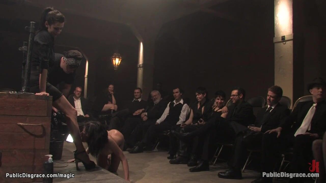 Sexy brunette French slave Cecilia Vega bound on knees and bent over with hands in strappado gets anal fingered and fucked in public bdsm theater