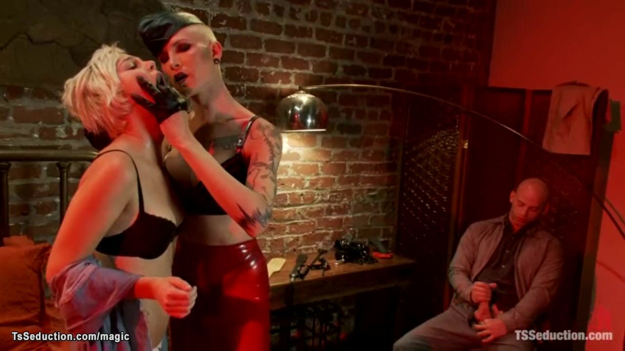 Tall tattooed big tits blonde shemale dominatrix Danni Daniels gets visit from kinky couple Chloe Camilla and Patrick Rouge at Red Light District and fucks them with big dick
