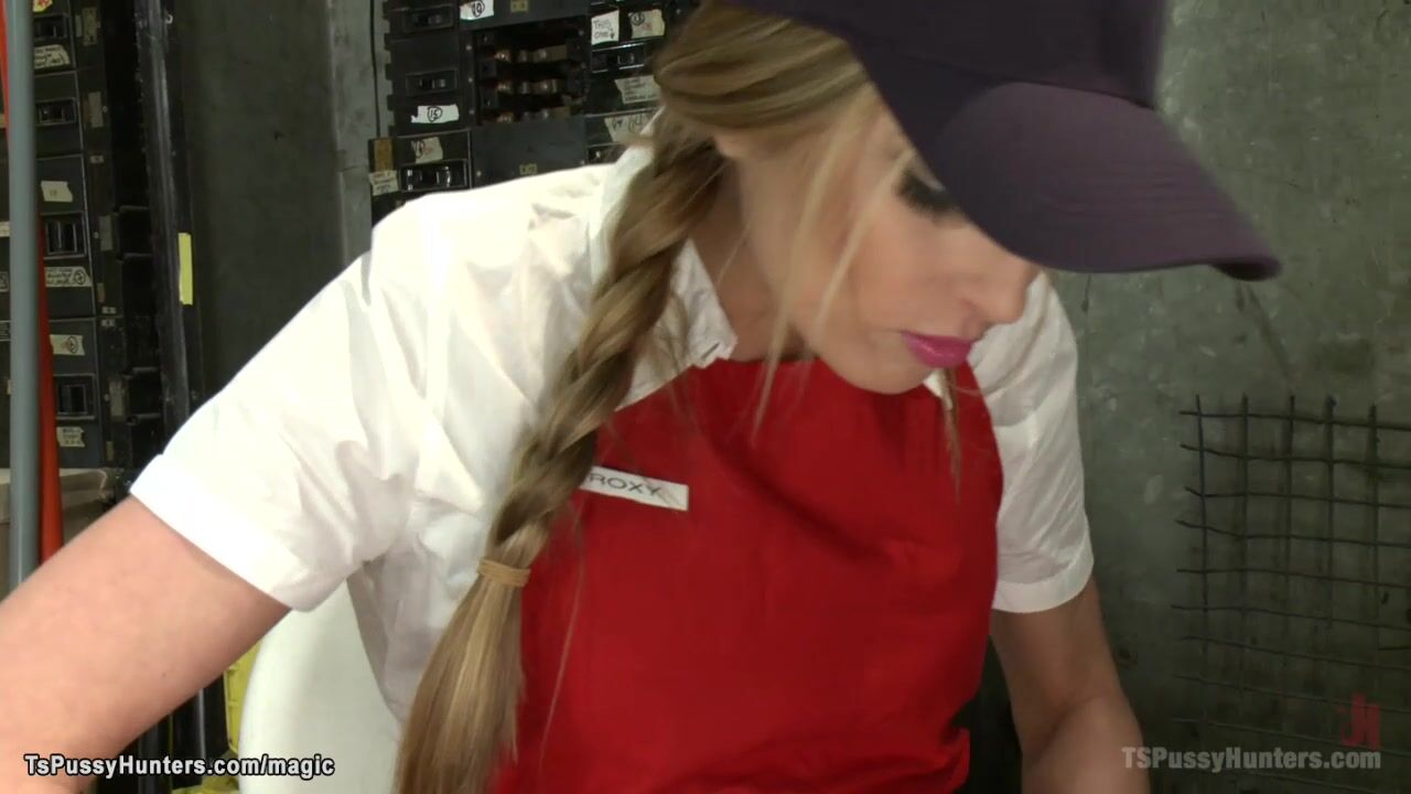 Shemale restaurant manager TS Foxxy caught blonde employee Roxy Rox masturbate in storage room then took her and with big dick fucked in the ass and pussy