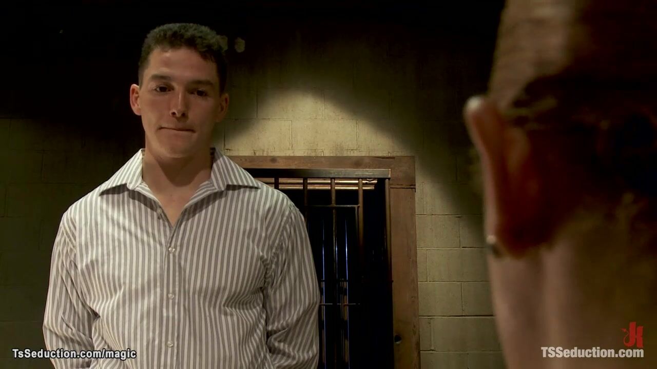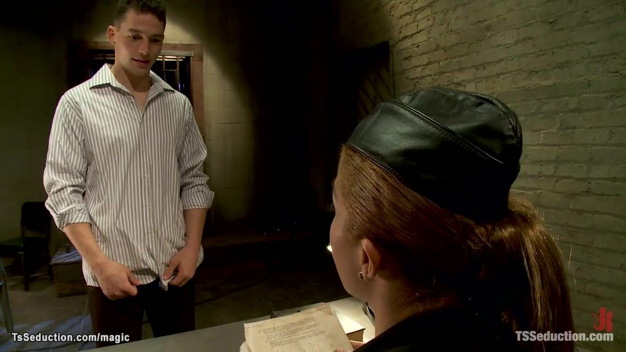 Shemale guard Latina Jessica Host binds employee Martin Lorenzo and sucks his dick then with big cock fucks him in mouth and ass in the office