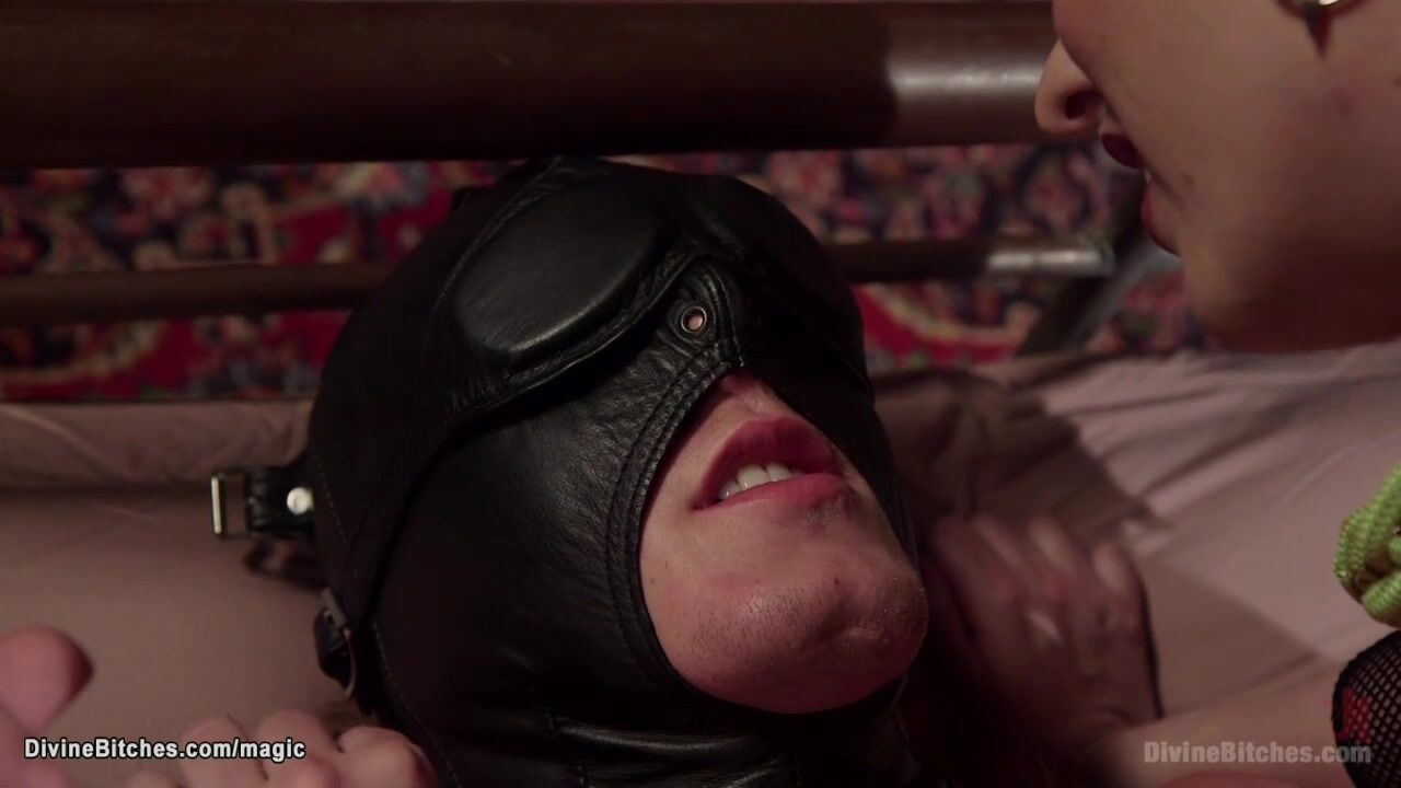 Suspended man Tom Faulk in upside down position gets spanked and paddled ass red by big tits mistress Cherry Torn then dildo gag rode