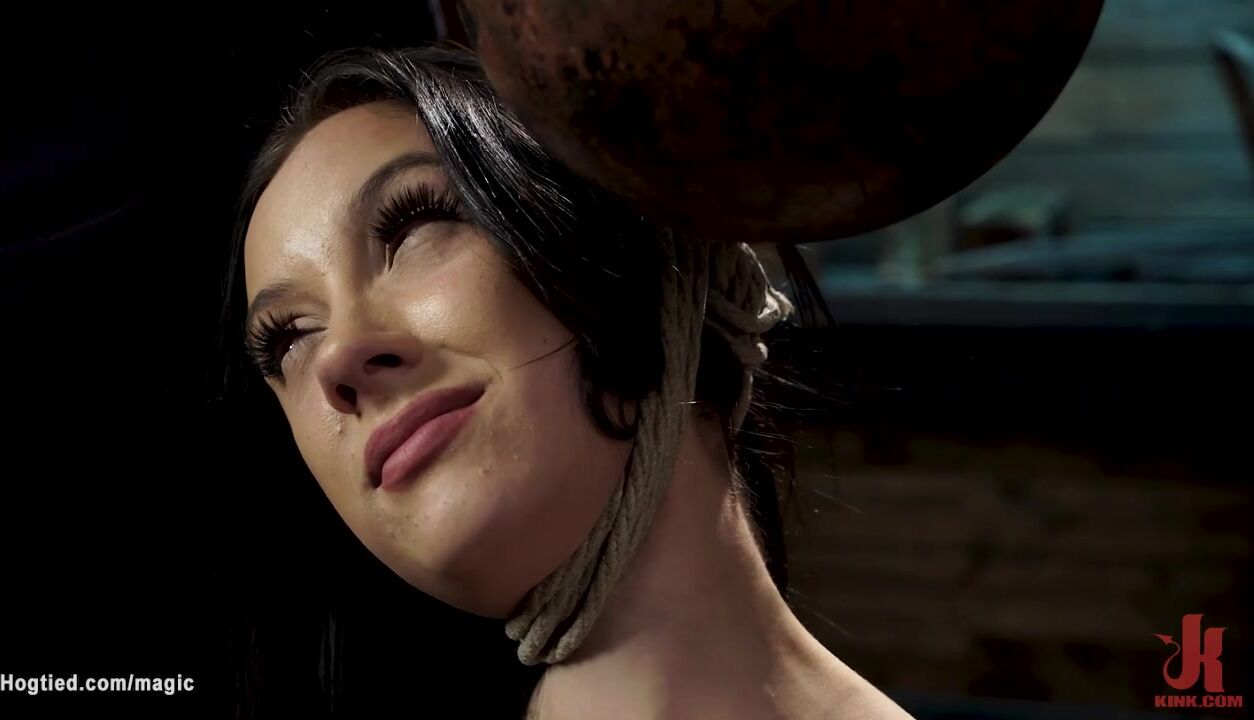 Slim brunette slave Jazmin Luv bound in chair gets heavy bowling ball hung for neck then laid on back and legs open then pussy finger fucked by master The Pope on hogtied