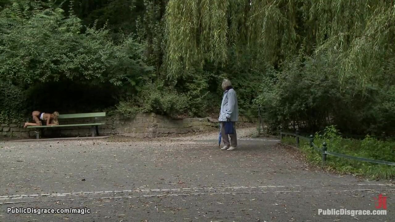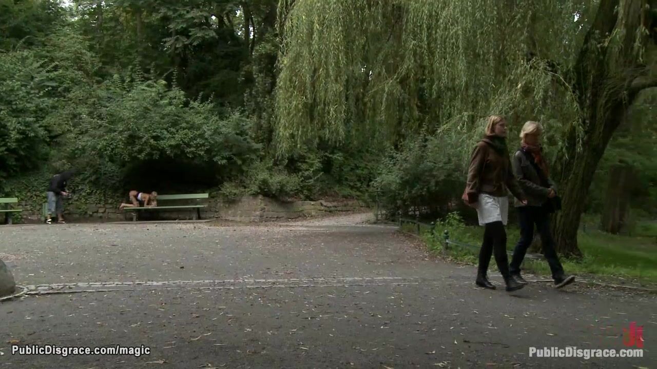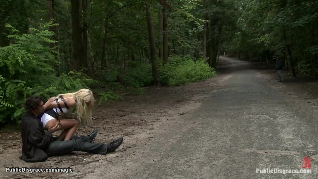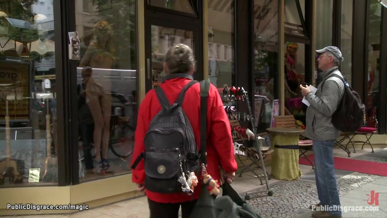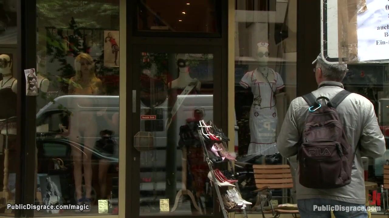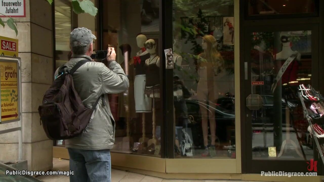 Slim small tits blonde Euro babe Blanche posing naked in public shop window then dragged in park and big cock fucked by Zenza Raggi