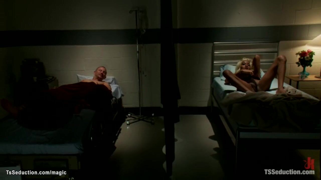 Big tits ebony shemale Mistress Soleli laying in bed in hospital and wanking bbc then waking up bound roommate Brenn Wyson and fucking