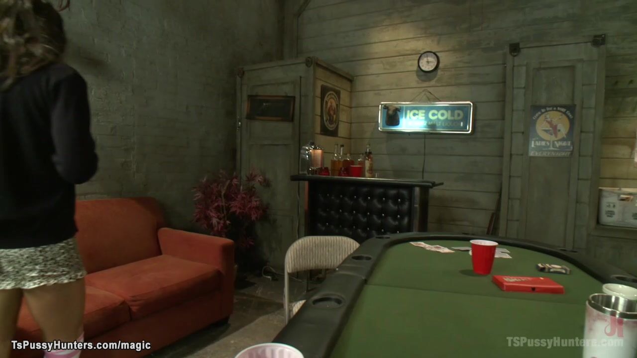 Tattooed big tits brunette shemale Honey Foxxx foll around with sexy brunette Asian bff Milcah Halili in her dads basement then fuck her with big cock