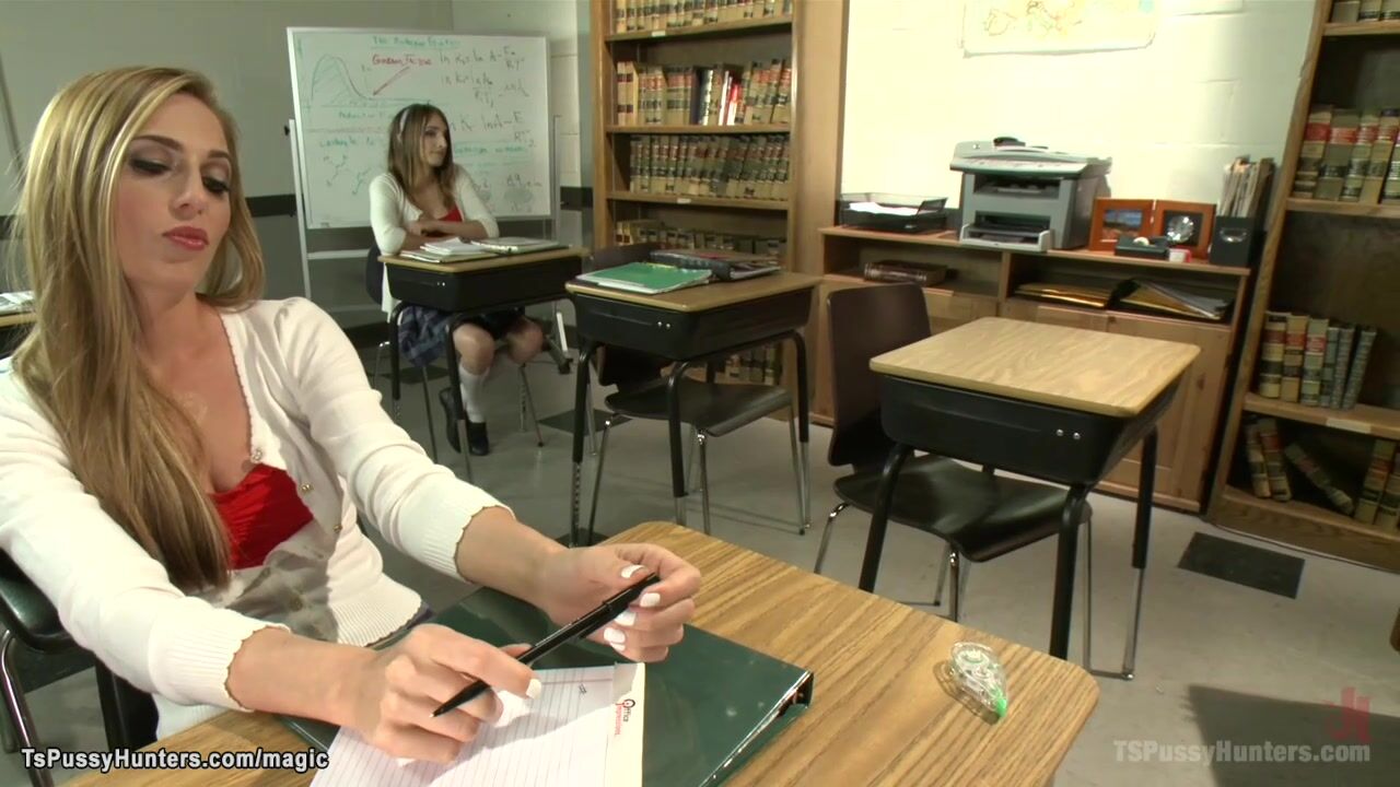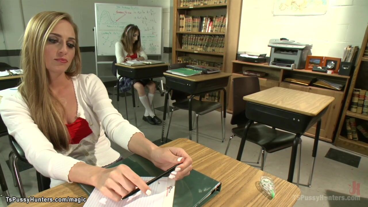 Brunette shemale schoolgirl Kelly Klaymour seduces her sexy blonde classmate Roxy Rox and then rough fucks her with big cock bent over desk