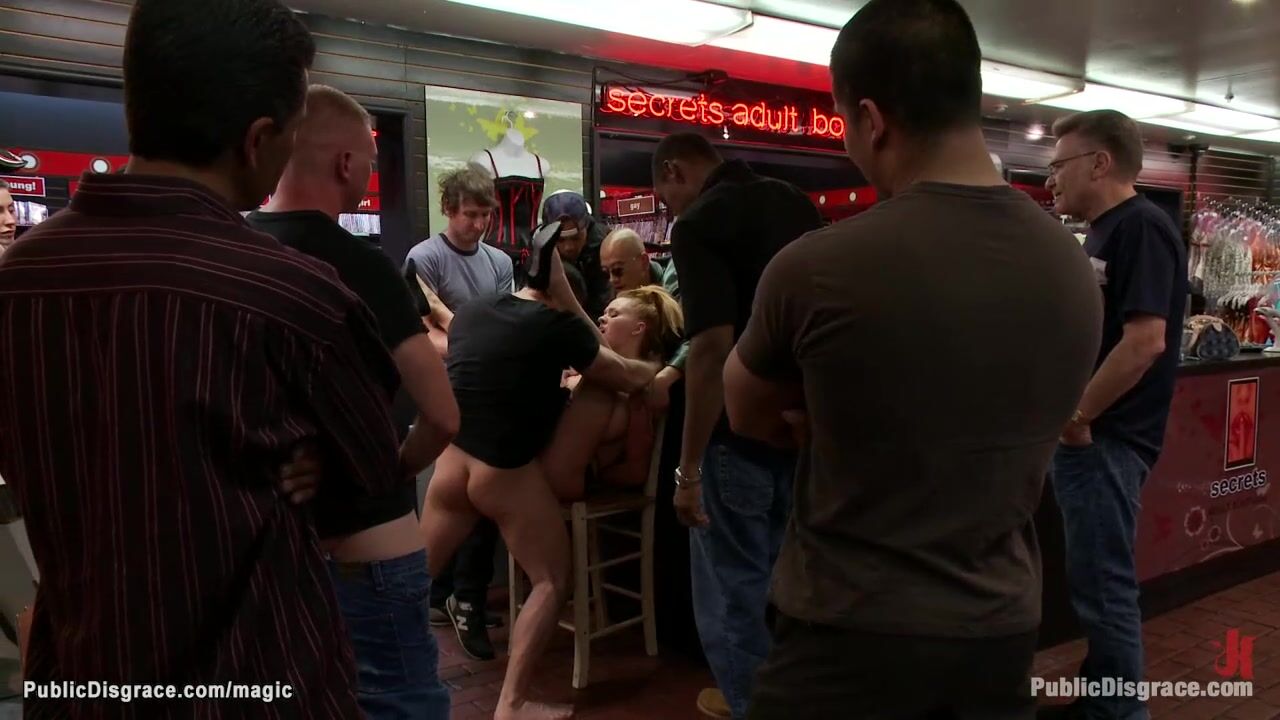 Dragged by John Strong huge boobs MILF slave Krissy Lynn bound in public porn store gets groped and fucked in pussy and ass with big cock in front of strangers