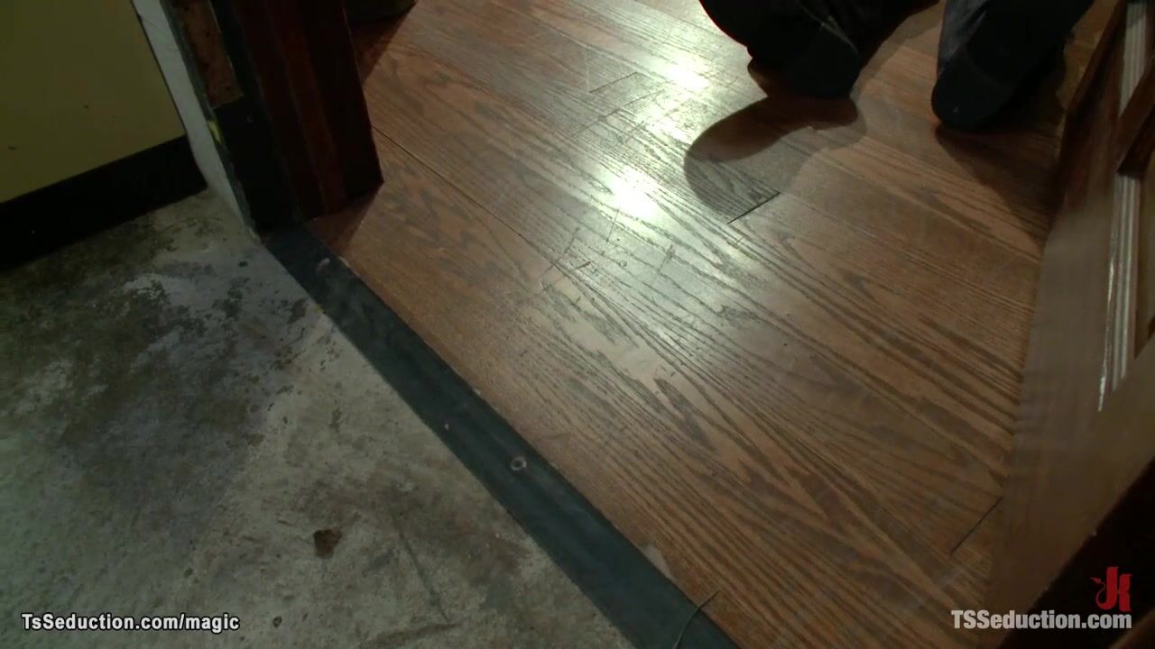 Shemale Carmen Moore brings home mall security guard Landon and binds him in bed then with girlfriend Jessie Cox anal gang bang fucks him