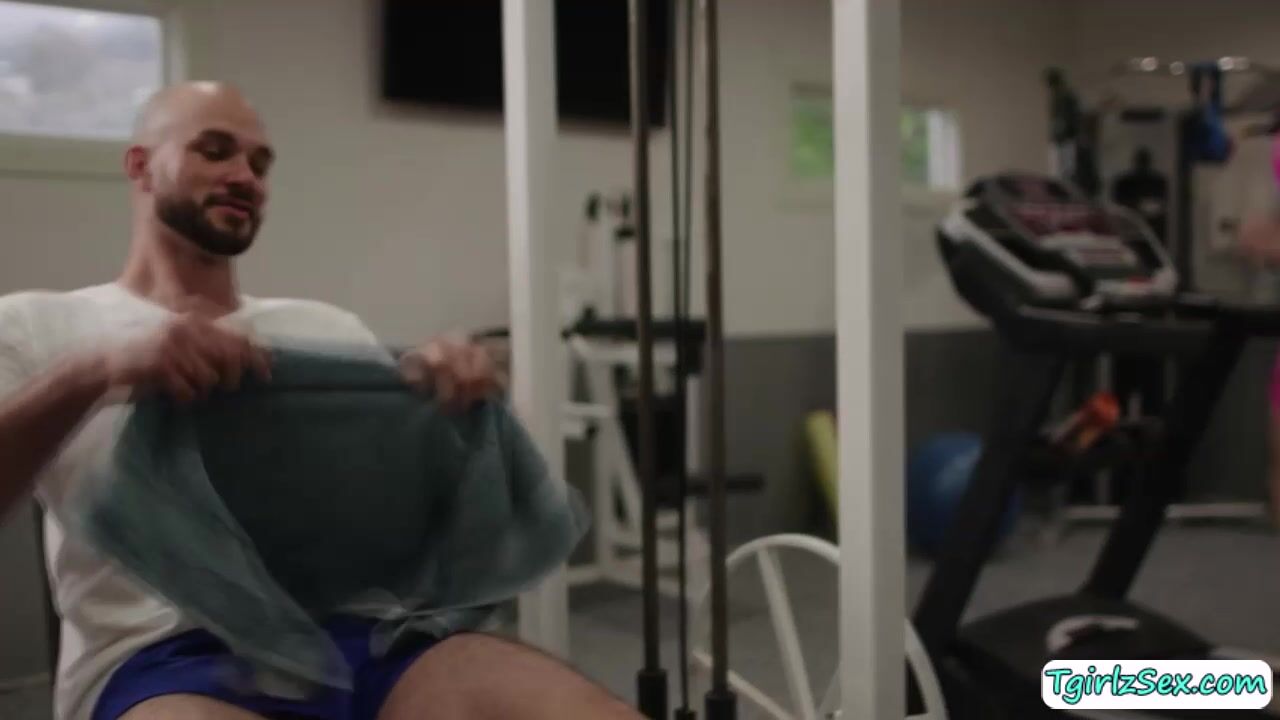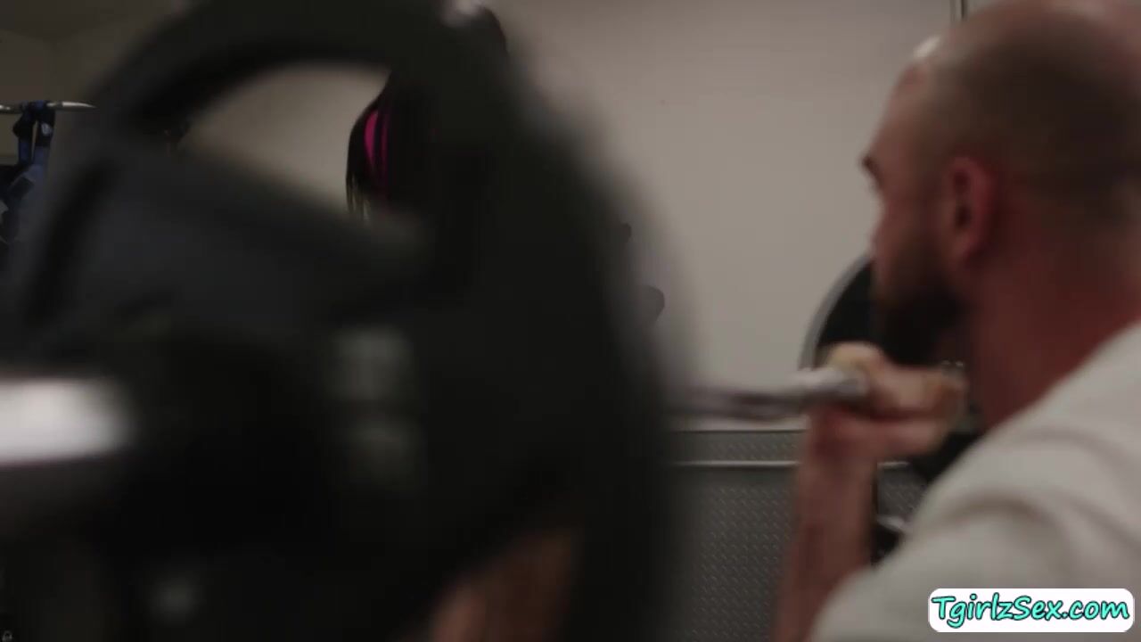 Big boobs brunette shemale Ariel Demure firts with hunk Cliff Jense in the gym when he surprisingly ulls down her pants and gives her big ass rimjob from behind. In return, the busty tbabe deepthroat blowjobs his big cock and enjoys hardcore anal bareback.