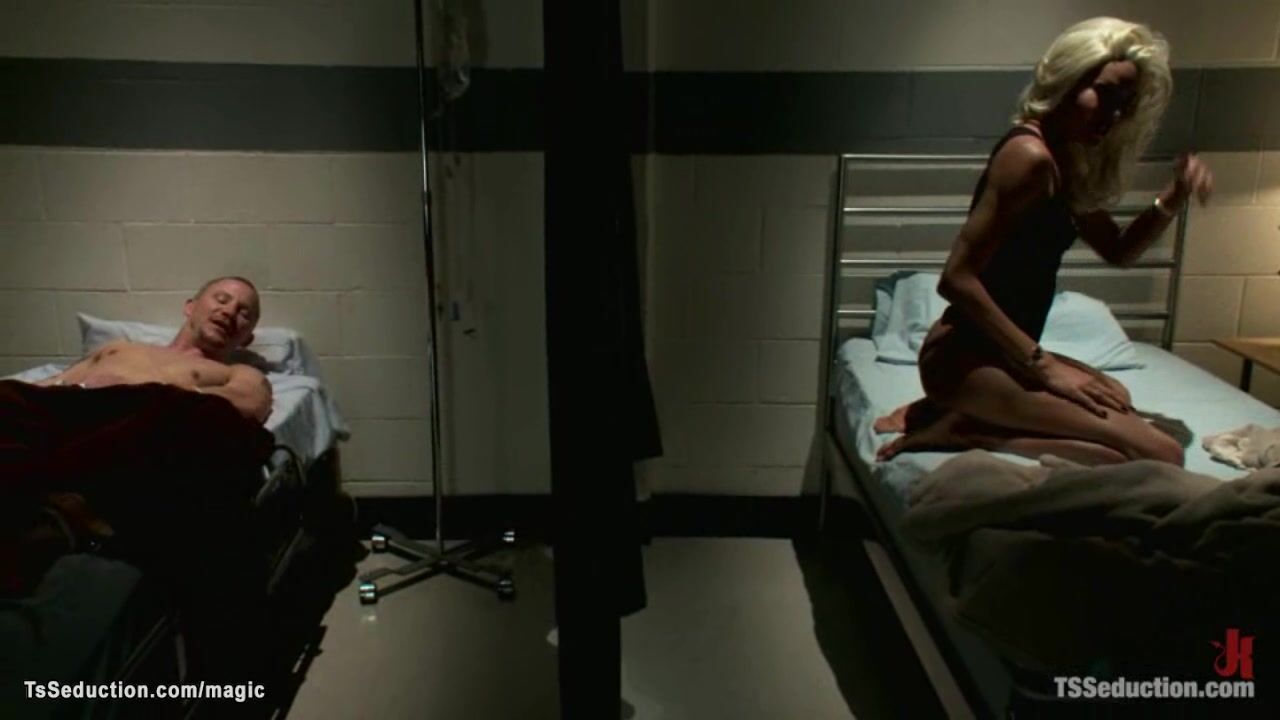 Ebony shemale Mistress Soleli wanking bbc in bed in hospital then jumping in bed of strapped patient Brenn Wyson and anal fucking him