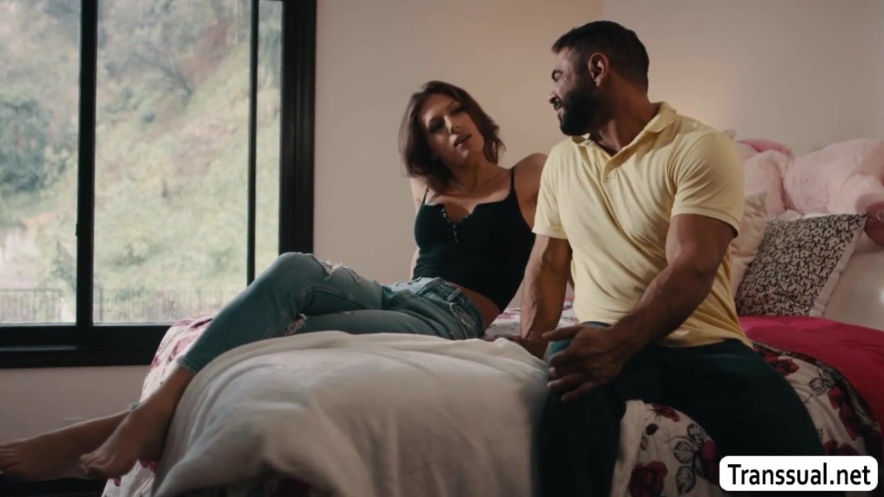 Big dude goes to the room of his shemale stepdaughter and then asks her to have sex.They start kissing each other on the bed and he then licks her ass to makes it wet.In return,TS stepdaughter sucks stepdads big cock and rides it after.