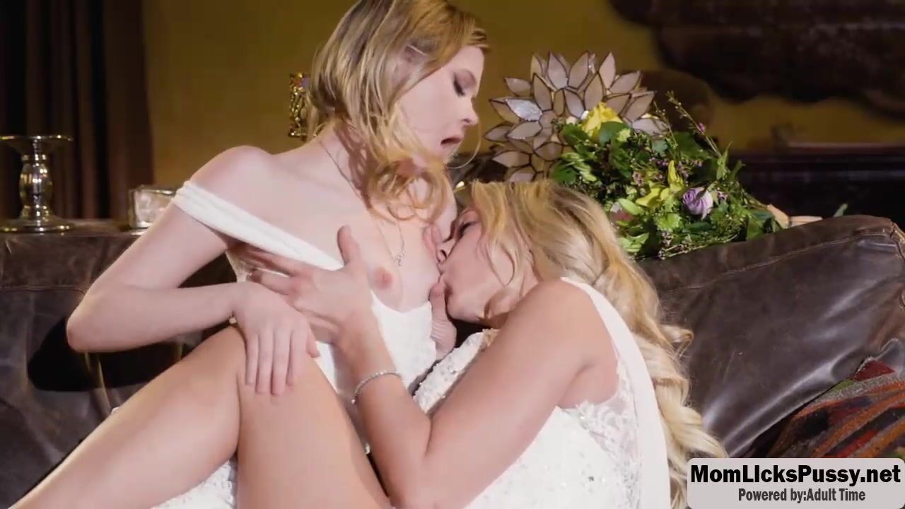 Busty milf and her teen stepdaughter are about to get married.After the ceremony,they jump into their honeymoon and they start kissing each other on the couch.Next is,they remove their gowns and start licking each other wet pussy.