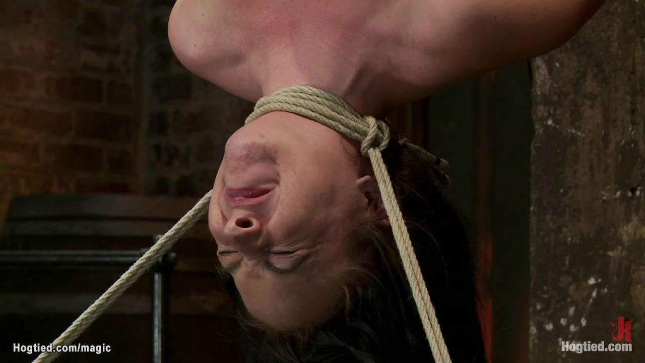 Small tits brunette slave Ashli Orion hung for legs in upside down suspension and pussy vibrated by busty lesbian and whipped by master Matt Williams on hogtied