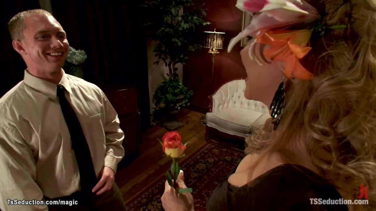 Biggest fan John Magnum gives rose to curvy blonde mature shemale star Johanna B then she binds him and sucks his big cock then anal fucks