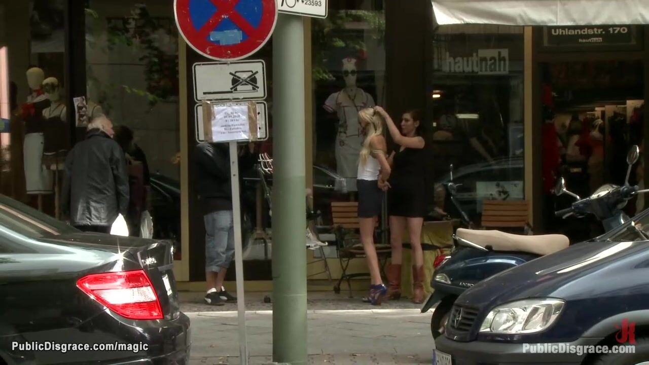 Small tits Euro blonde Blanche Summer is bound with hands in box tie then gagged in public streets by Princess Donna Dolore then mouth fucked by big dick Zenza Raggi in the park