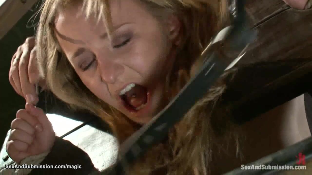 Blonde slave Jessie Cox is bound down on knees and gagged then mouth fucked till in suspension pussy clamped then ass hooked and pussy fucked by big cock master Steve Holmes