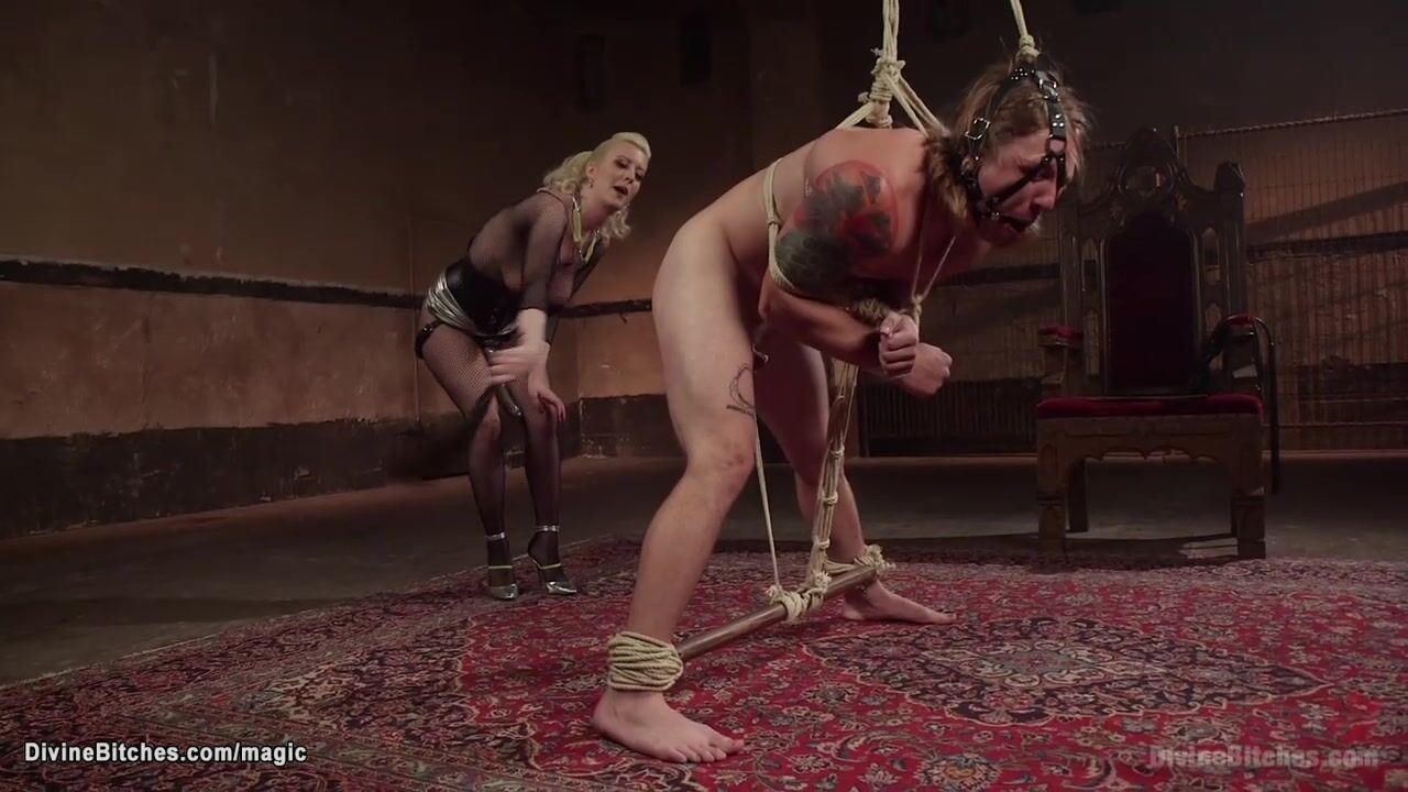 Blonde big tits femdom in fishnet lingerie Cherry Torn whips ass to tattooed bound man Tom Faulk then with strap on cock pegs him till rides his face
