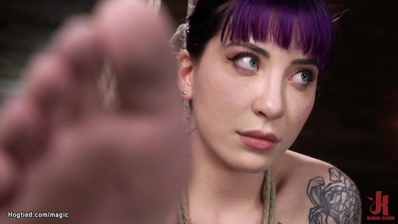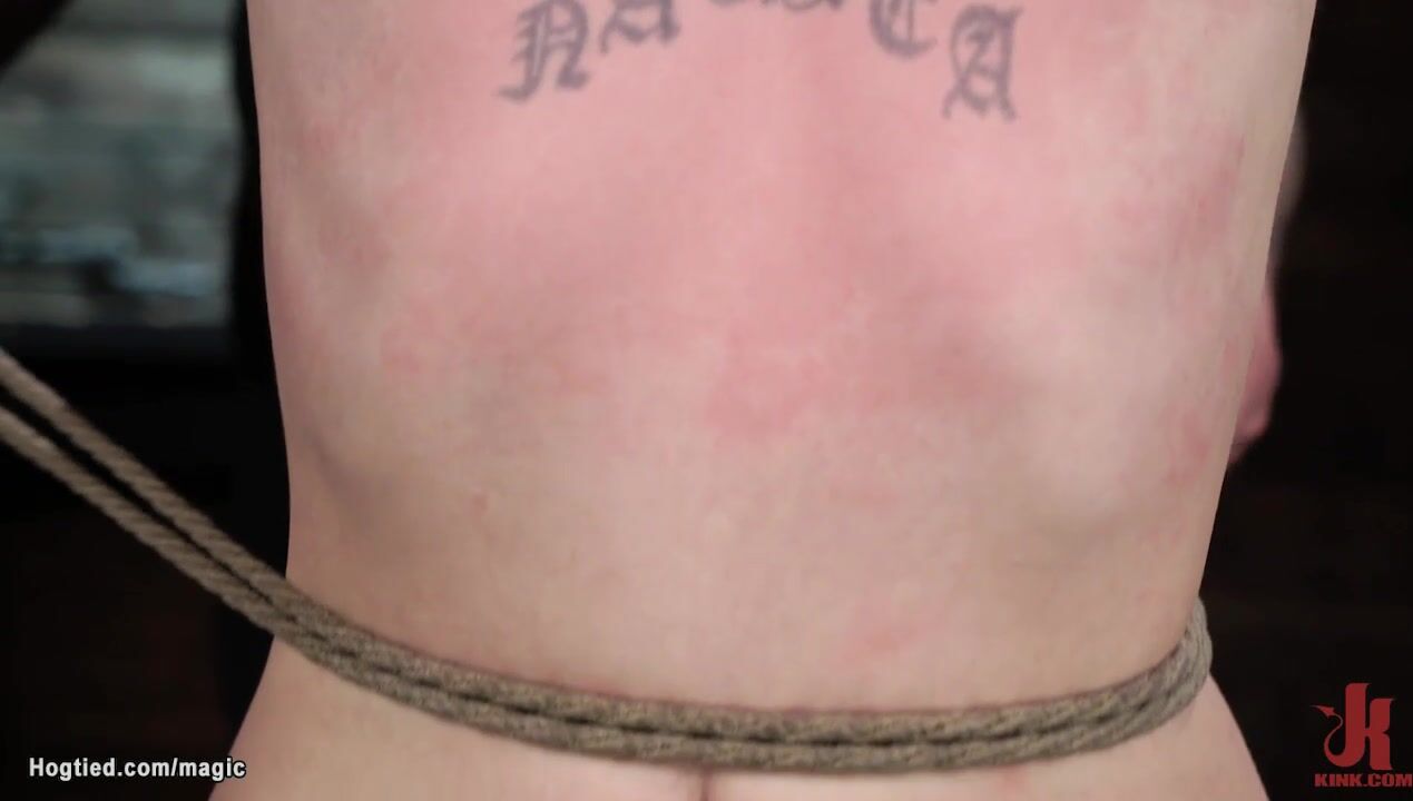 Bound in standing position with hands above head tattooed petite slave Charlotte Sartre gets whipped then suspended and pussy fucked with dildo by master The Pope on hogtied