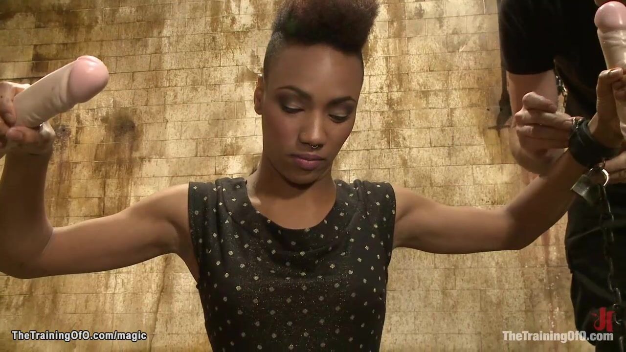 Slim ebony slave trainee Nikki Darling wanking big dildos then master James Mogul whipping her while she is squating on dildo with bound torso and ankles