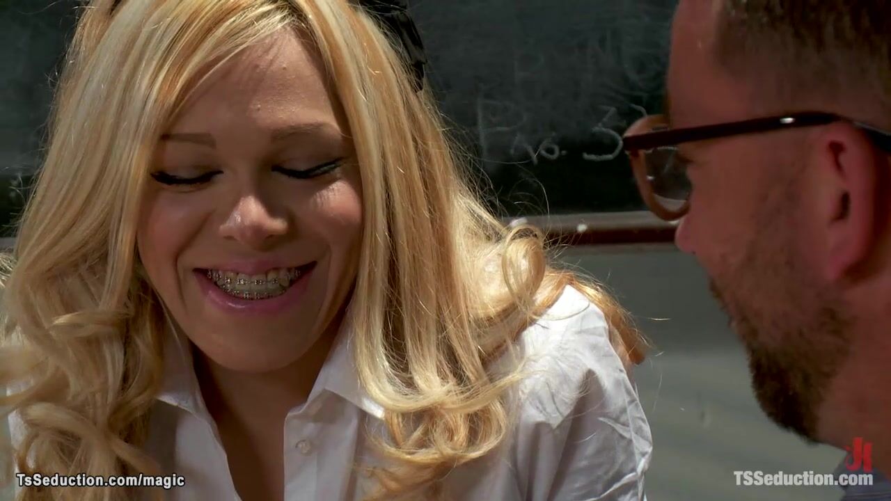 Big tits blonde shemale student Paris A seduces English professor Rom Fox then makeshis worship her boobs till anal fucks him bent over desk in classroom