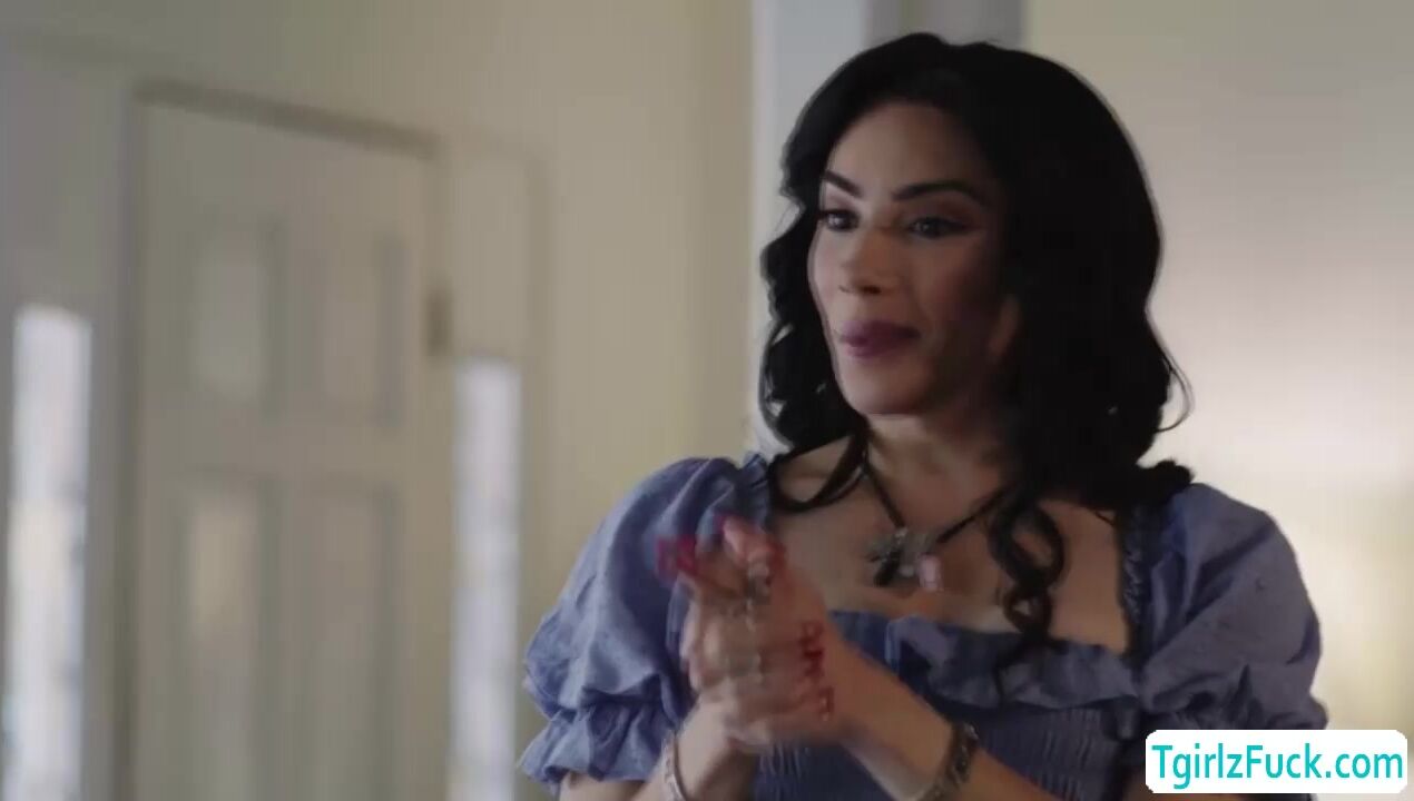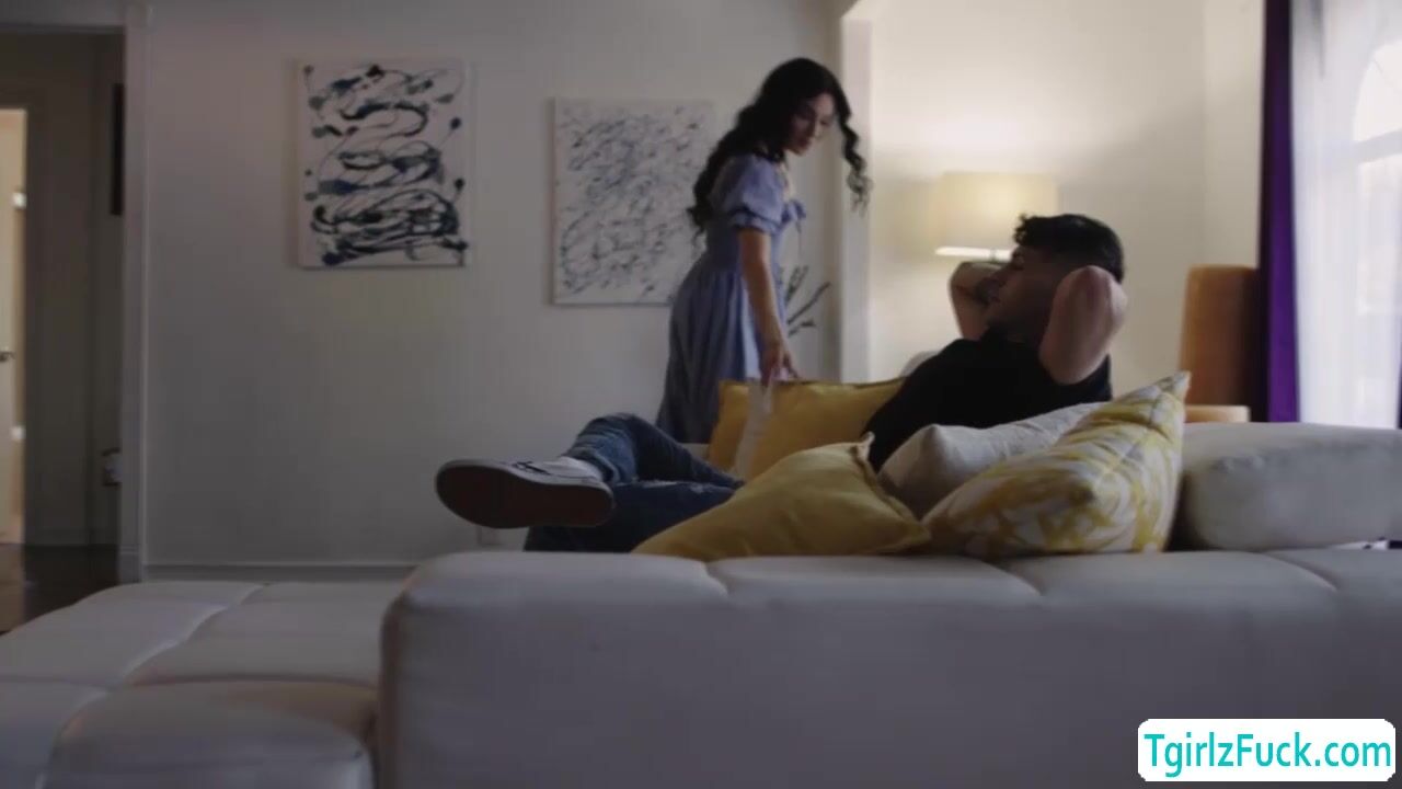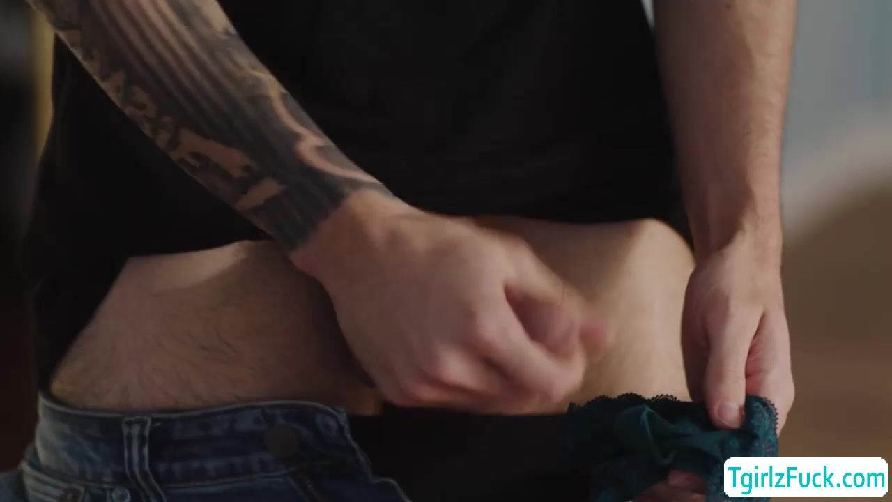 Tall and brunette small tits shemale Ariel Demure striptease lingerie flirting with hunk Franco Styles in bed. The skinny tbabe whips out his big cock for a deepthroat blowjob while masturbating big tranny cock then bends over her big ass with hardcore anal bareback.