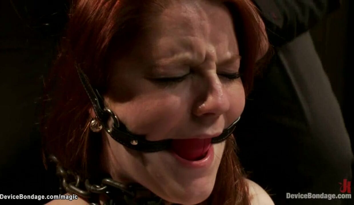 Brunette slave Diamond Dahlia is strapped by metal then clamped till in metal device pinned to the wall whipped then Erin Heart tormented bound on the ground with legs open and whipped