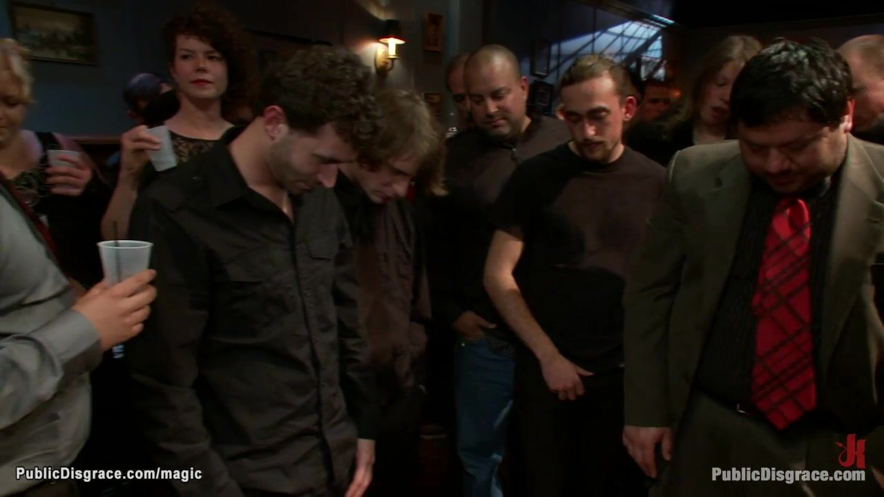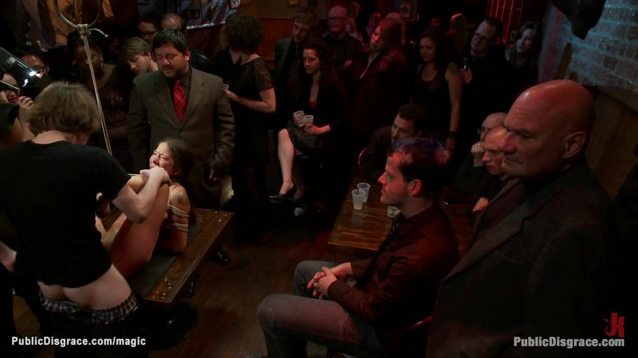 Shaved pussy slave Vai bound on the ground spreaded gets fisted then fucked by big cock of James Deen and lezdom banged by Princess Donna Dolore in public crowded bar