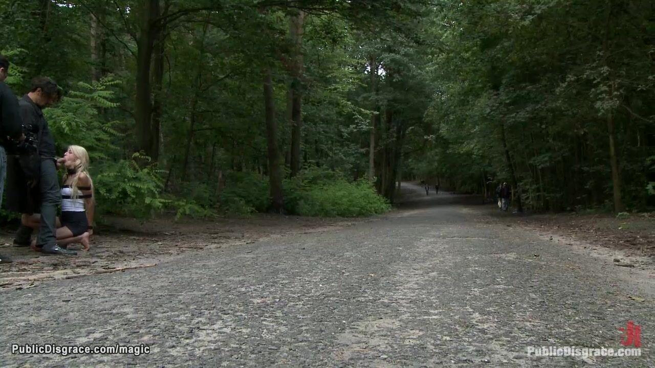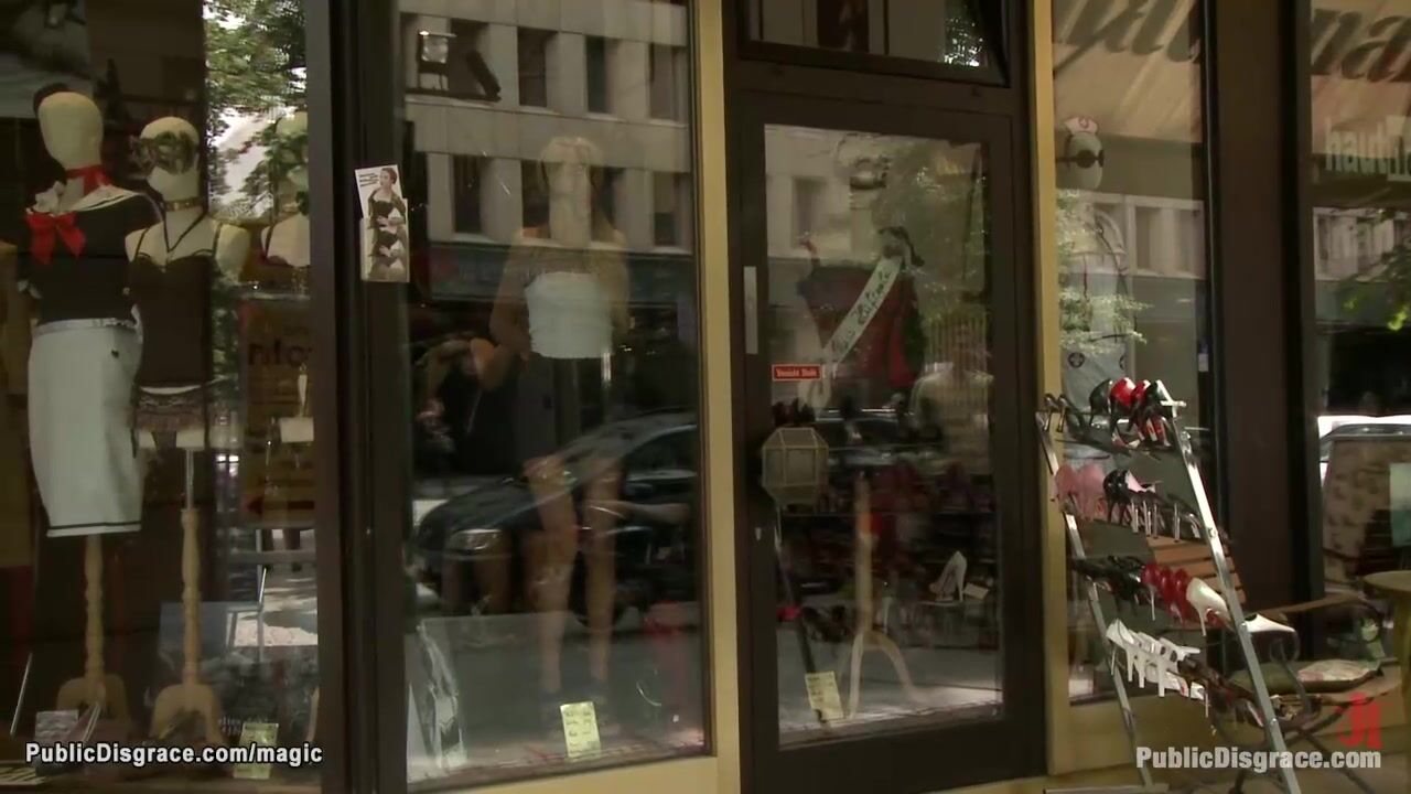 Bound blonde Blanche Summer is stripped in public window by Princess Donna Dolore then brought and spanked in the park till fucked by big cock Zenza Raggi