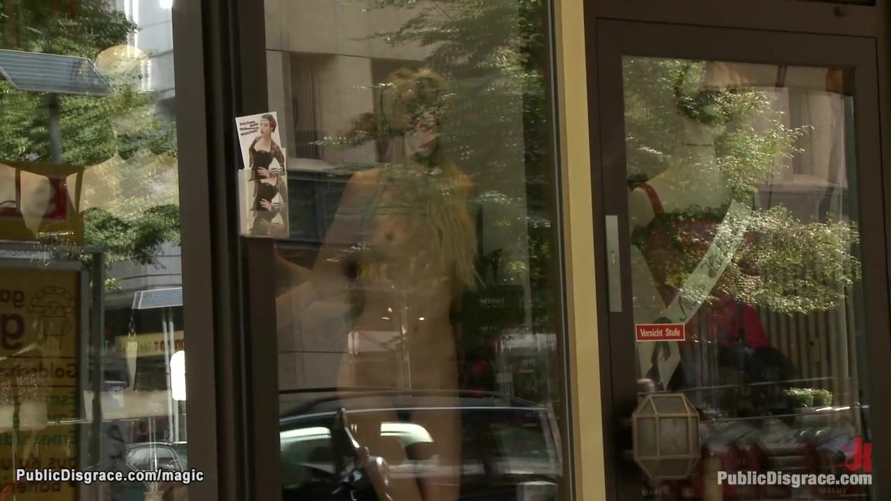 Bound blonde is stripped in window