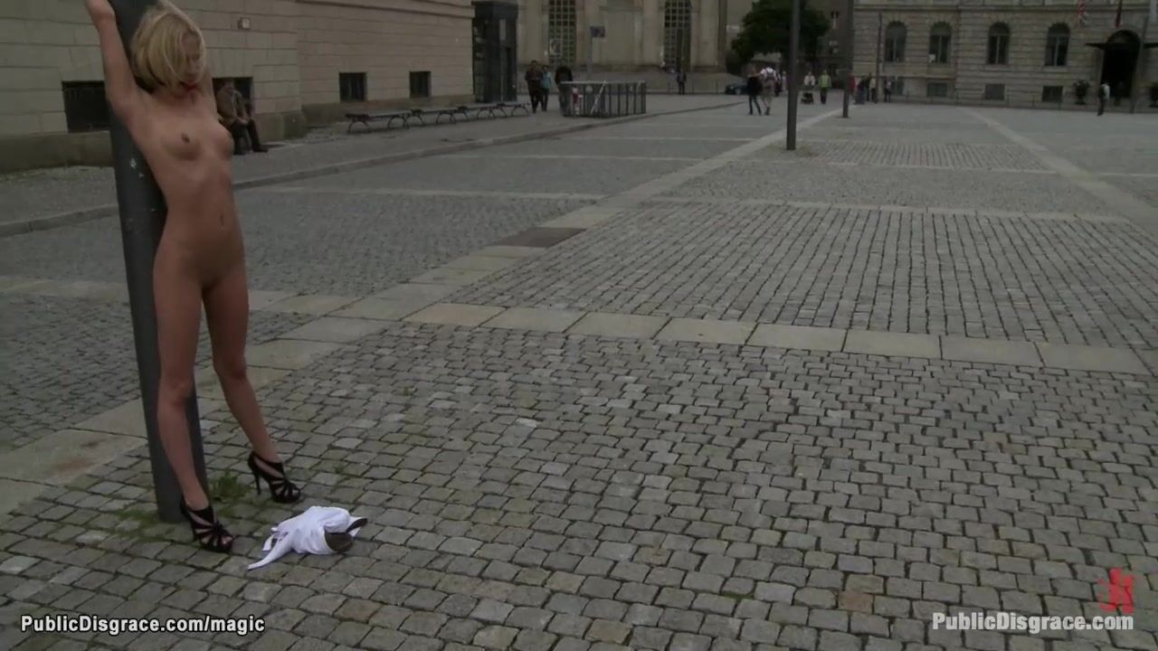 Blonde European hottie Paris Pink bound naked and exposed in public square then gang bang fucked by big cocks in various public places