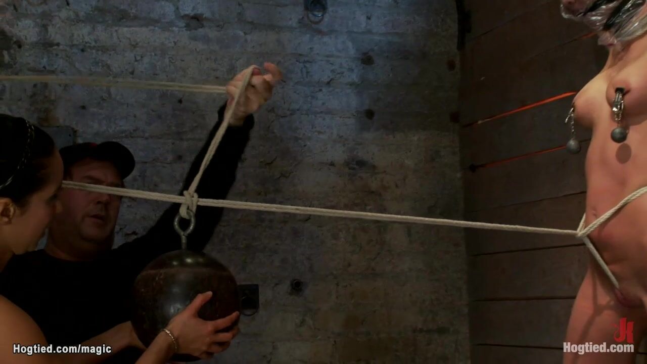 Big tits blonde slave Kaylee Hilton is bound to the wooden wall by master Matt Williams and big boobs Isis Love then bowling ball bound to her crotch and naked body caned