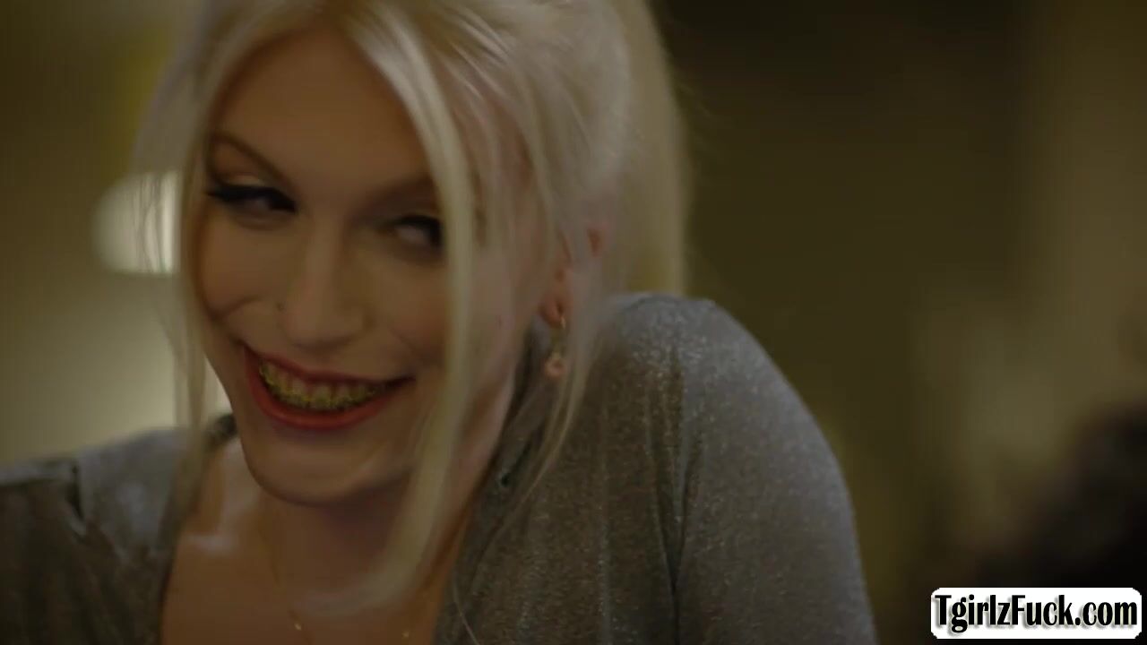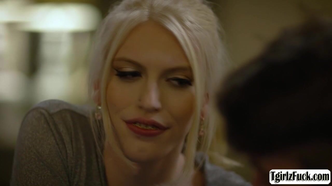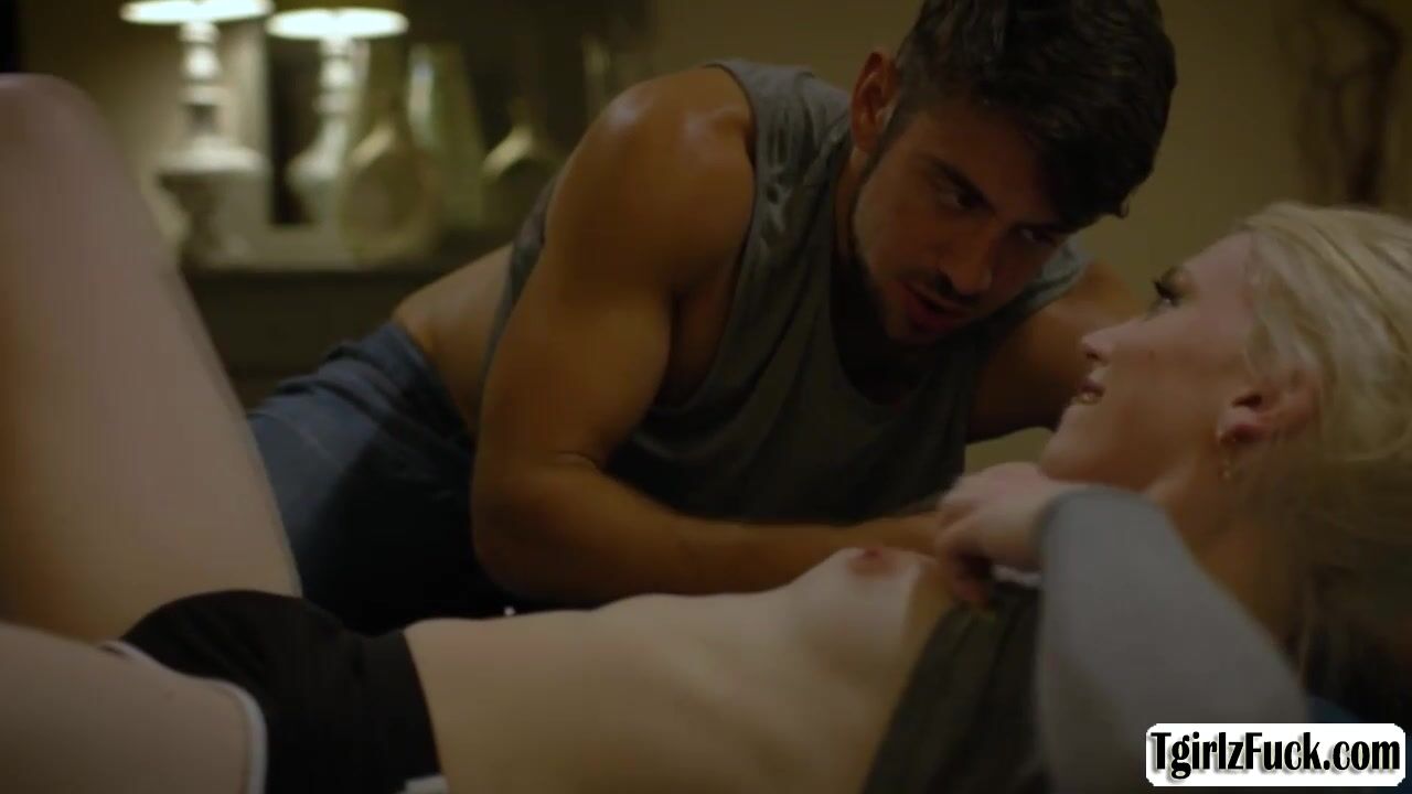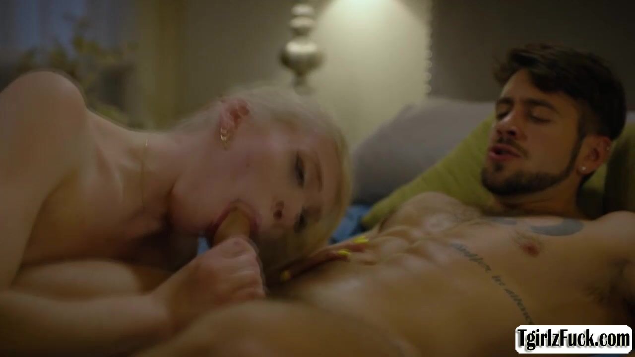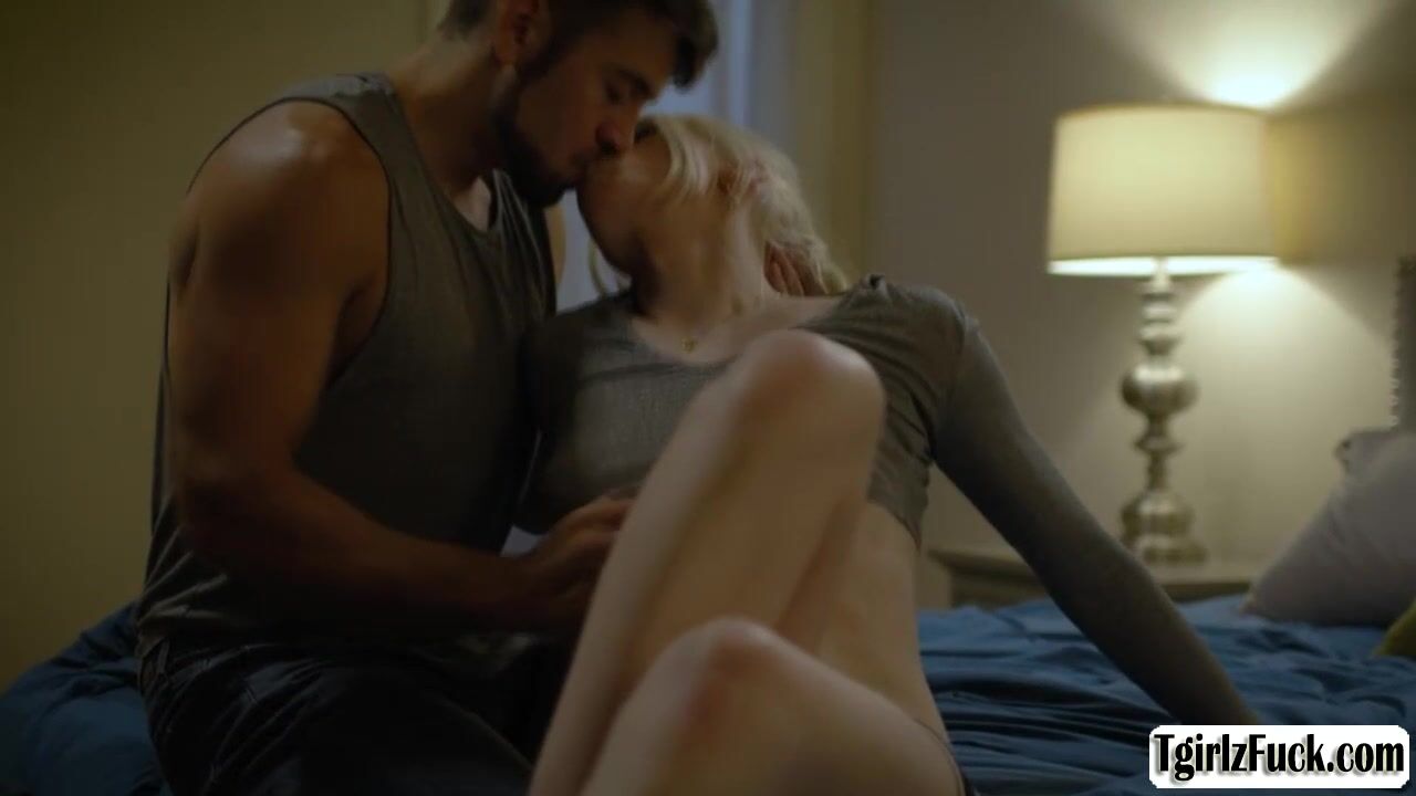 Skinny blonde shemale Izzy Wilde flirts with Dante Colle in bed slowly kissing then she deepthroat blowjobs his big cock. The small tits tbabe stretches assholes for a hardcore anal barebacked doggystyle and missionary while masturbating tranny dick.
