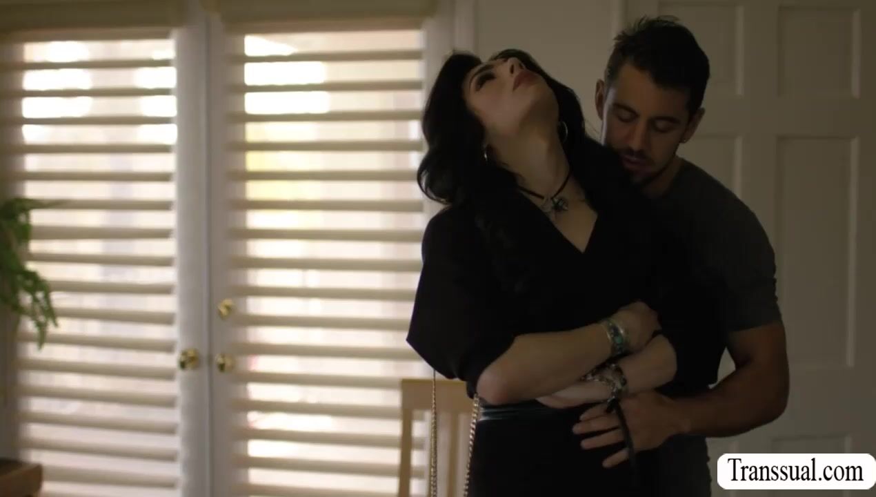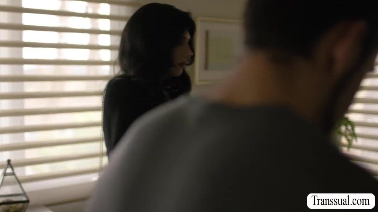 Thin shemale confronted her ex boyfriend for sending their sex video on her.After that,instead of getting mad,they start kissing each other and she then throats his big cock passionately.In retur,the guy bareback fucks her tight ass so hard.
