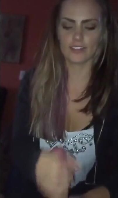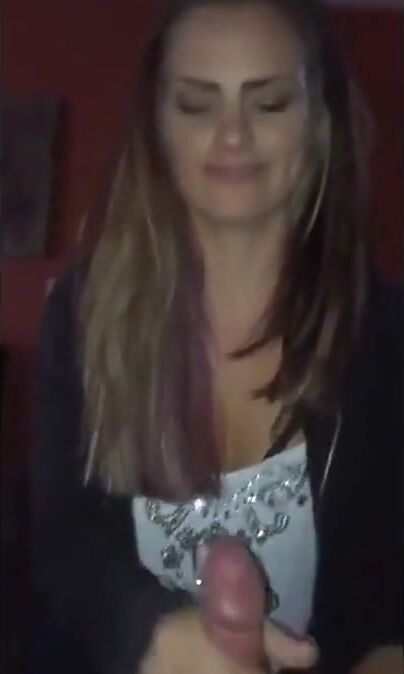 Blonde babe gives a handjob to her horny lover with her clothes on.