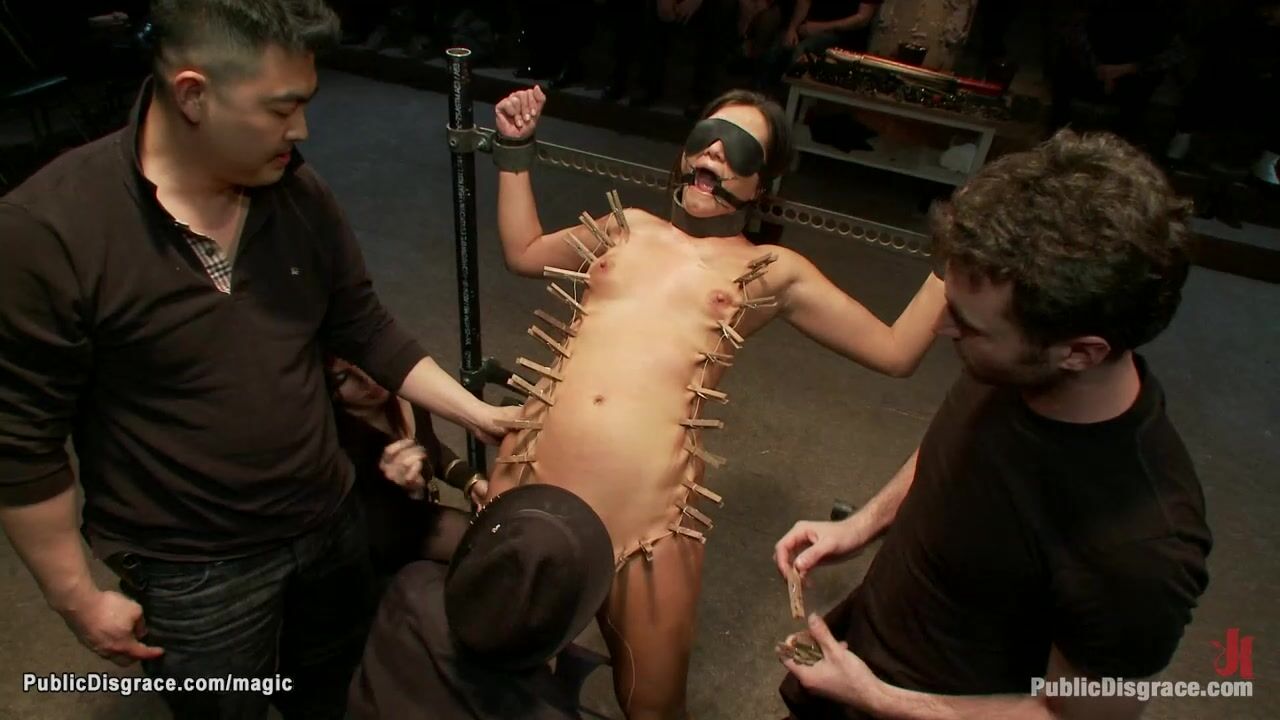 Bound and blindfolded brunette slave Cece Stone is gagged and zippered then mouth and pussy fucked by big dick James Deen in public