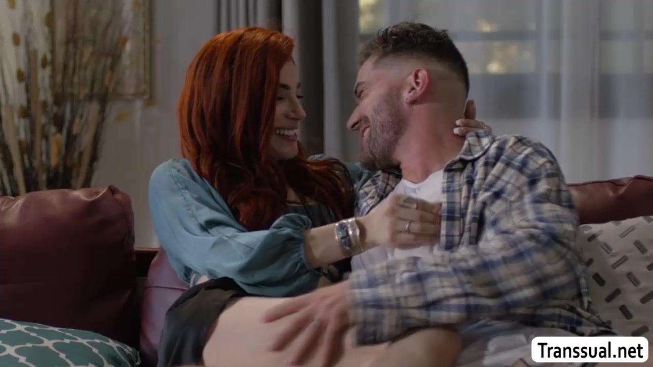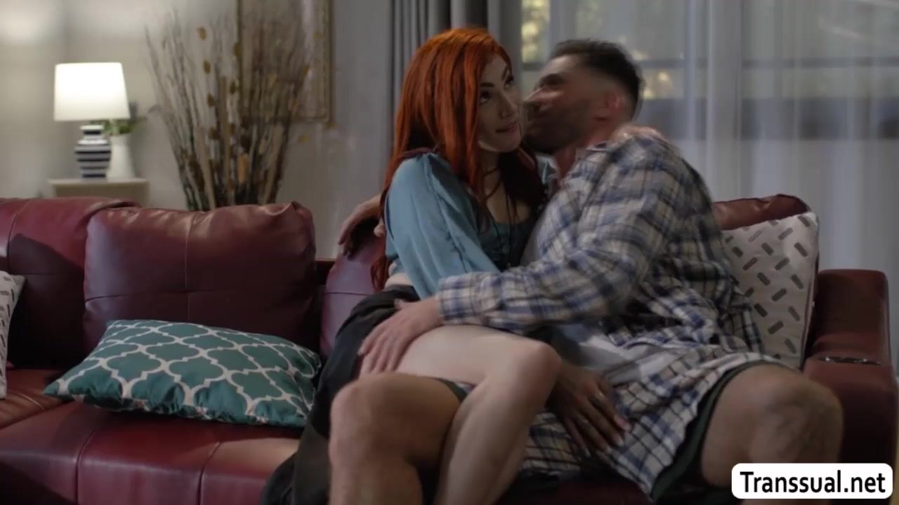 Redhead shemale brings her guy mistress into her place while her husband is out.They start kissing each other on the couch and she then throats his hard big cock passionately.In return,the guy bareback fucks her tight ass so deep and hard.