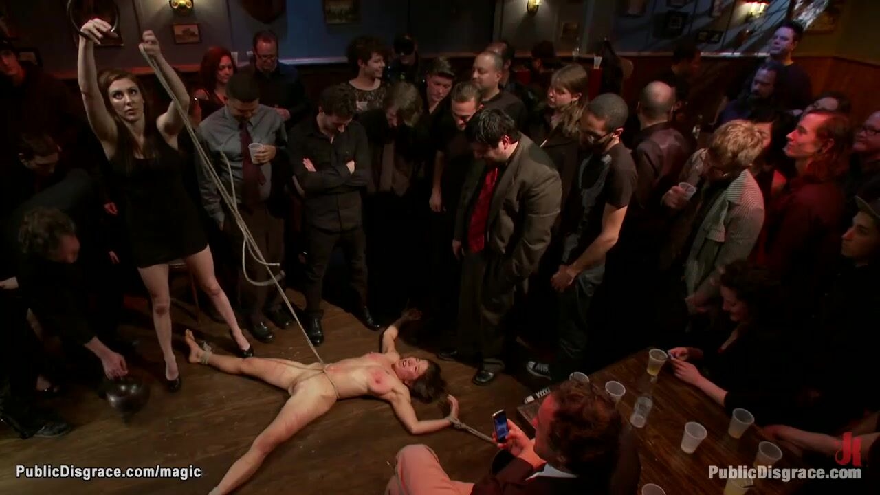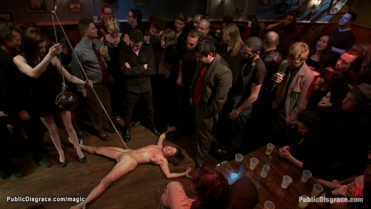 Brunette slave Vai bound spreaded on the floor with bucket bound to crotch then in various positions hard fucked by James Deen in crowded public bar