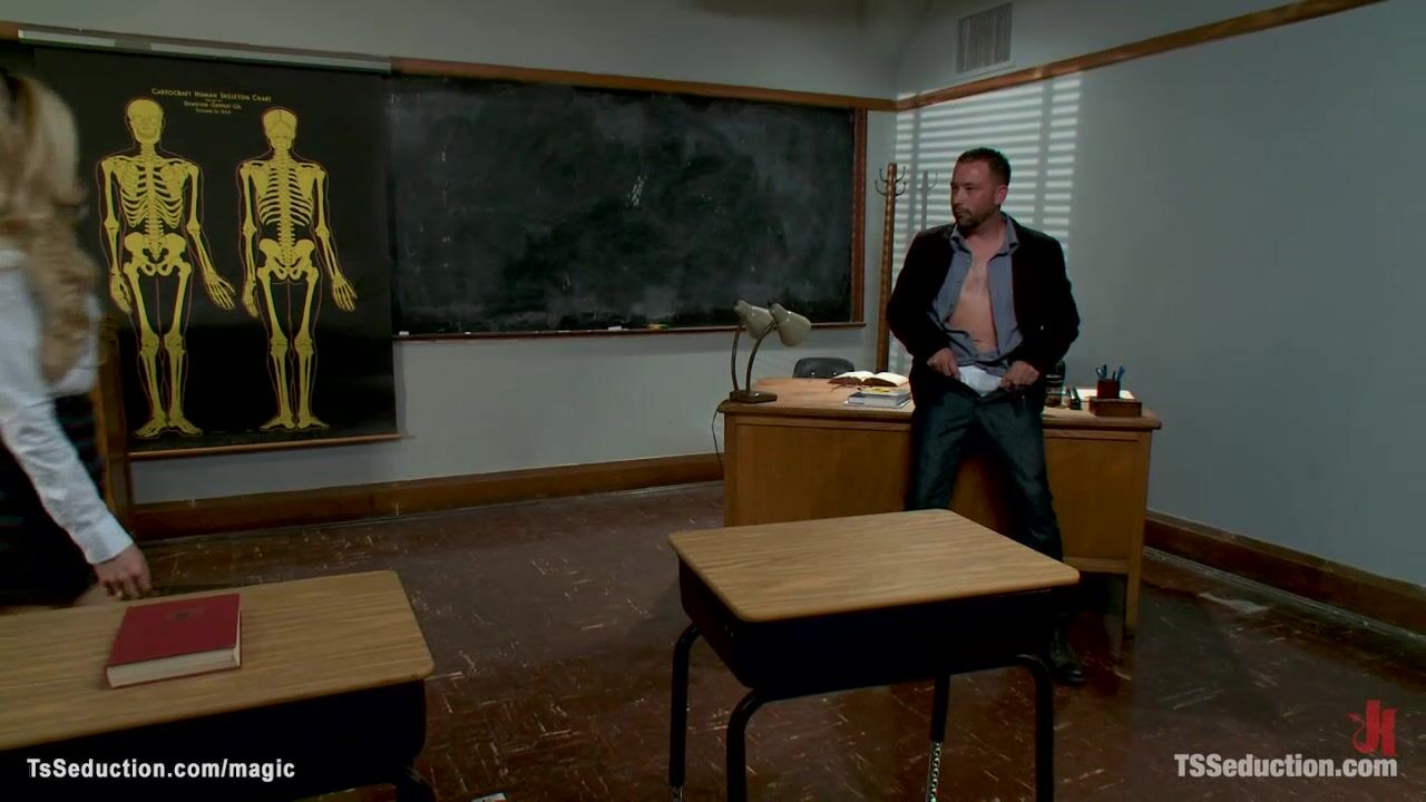 Blond big tits blonde shemale college slut Paris A sucks cock to English professor Rom Fox then with big cock fucks him in mouth and cums