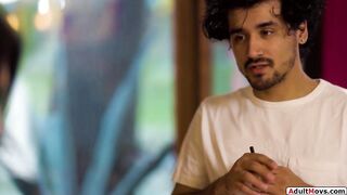 Mommy shows her stepson her big tits when posing for him and lets him touch them.The big boobs stepmom kisses him while she gives him a handjob.The mature babe deepthroats his big cock.On her back the petite milf is fucked hard in her pussy
